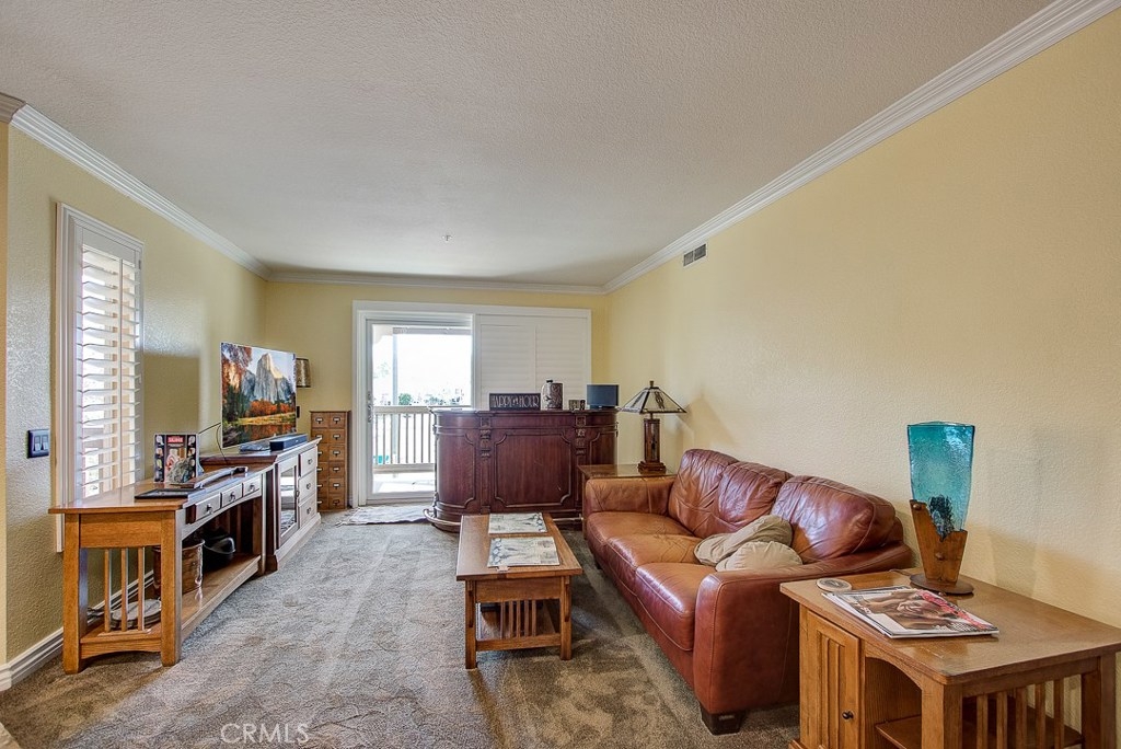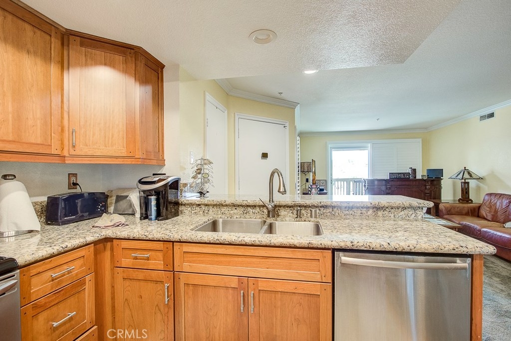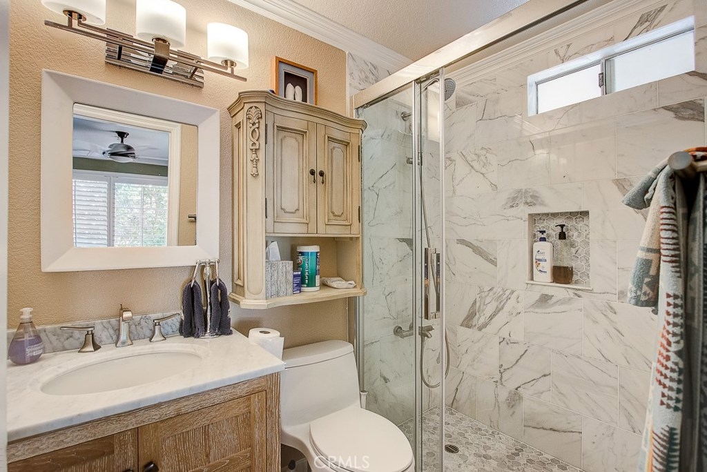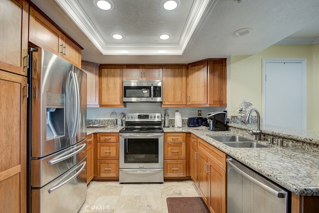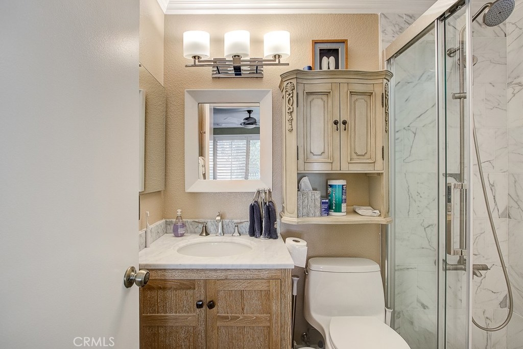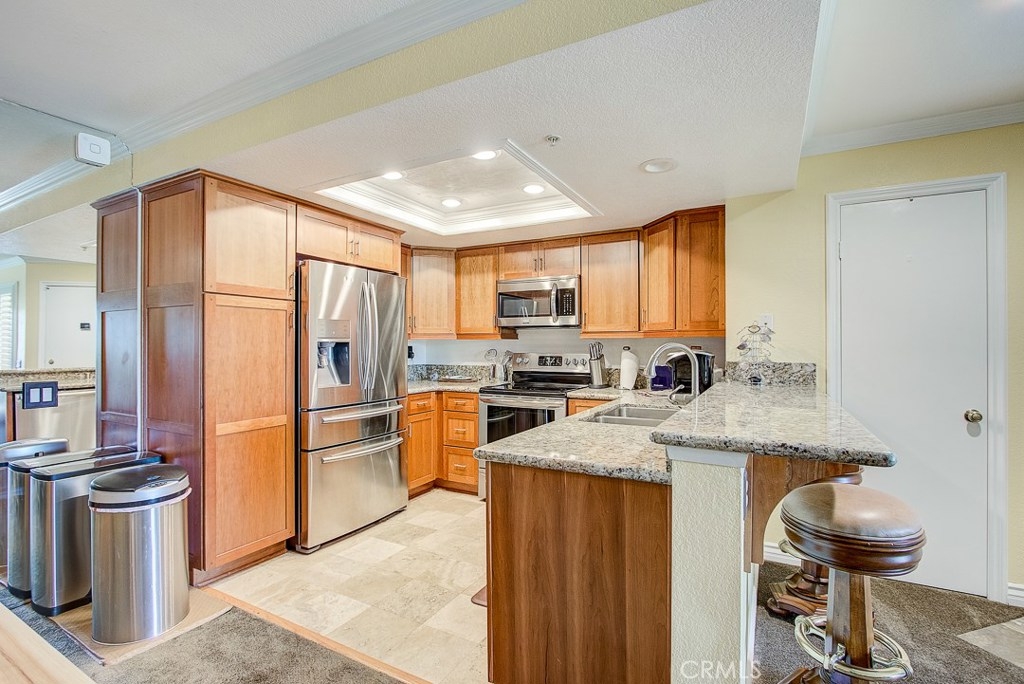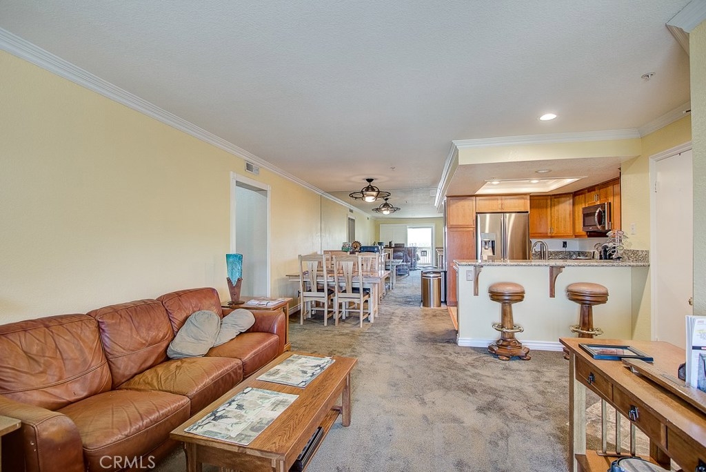 Wonderful Canyon Hills condo in a desirable location in the city of Orange! Through the entry is a remodeled kitchen with beautiful custom Cherry wood cabinetry, stainless steel appliances, and upgraded granite countertops. The kitchen overlooks an open living room and dining area with crown molding, plantation shutters, and modern paint tones. Large sliding doors open to a private balcony with views of the neighborhood and Peters Canyon. Enjoy relaxing on the spacious balcony and enjoying a cup of coffee in the morning. The spacious master bedroom is open and bright with large light-catching windows. The master ensuite is beautifully adorned with marble tile look walk-in shower and beautiful vanity. There is an additional spacious bedroom with a walk-in closet that has an adjoining full bathroom nearby. 2 car garage! This wonderful community boasts a pool and clubhouse and is close to Peters Canyon hiking trails, Santiago community college, shops, and restaurants.