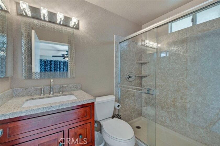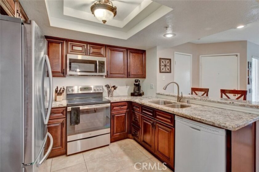In the desirable condo community of Canyon Hills. This corner unit facing the greenbelt is a two bedroom and two bathroom has a fully remodeled kitchen and master bathroom. Kitchen with dark wood cabinets and granite counters and upgraded sink and faucets and kitchen lighting. Open to the dining room and living room. Sliding doors off the living. Neutral carpet and walls. Bedroom one with walk-in closet. Master bedroom with on-suite master bathroom fully remodeled and walk-in closet. Inside laundry. This unit has two single car garages #430 and #431. Walking distance to shopping, hiking trails and freeways. This is a must see!
