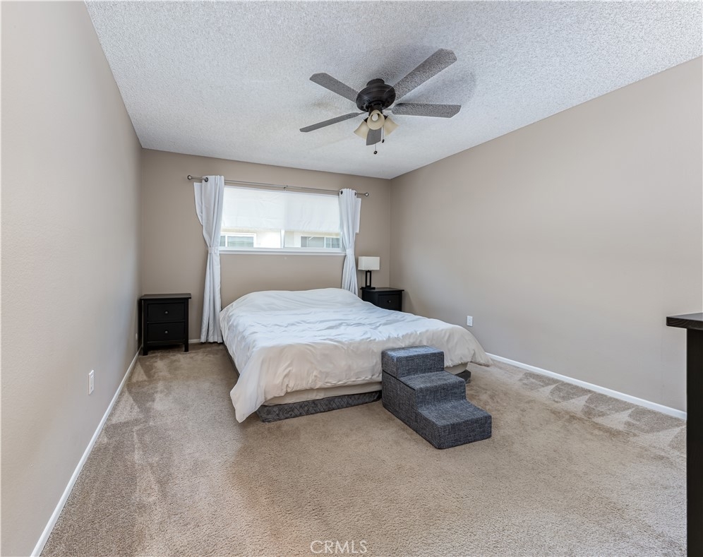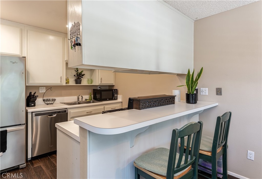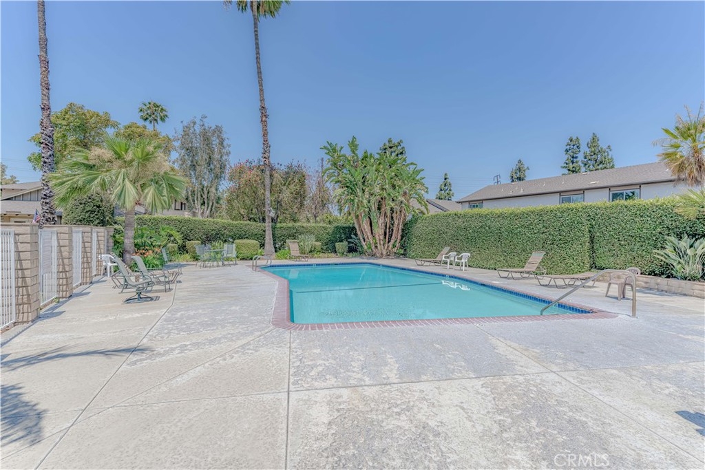 Welcome home to Orange! This cozy and sun-soaked 2 bedroom, 2 bathroom condo showcases tile flooring, new dual pane windows, resurfaced kitchen cabinets, and LED lighting. Walk upstairs and see a quaint front porch perfect for outdoor lounging. Through the front door is the spacious living room with a warm fireplace. Cool down during hot summers with the central A/C or the community pool. Adjacent to the living room is the kitchen boasting an eating area, coffee bar, and modern hardware on the newly painted cabinets. Stainless steel appliances include a 5 burner gas range, oven, dishwasher, and refrigerator. Nestled in the hall is a full bathroom, the master bedroom, and a guest bedroom. A private en suite and walk-in closet are featured in the roomy master. The guest bedroom has ample space with a mirrored sliding door closet. Located within walking distance of the sparkling pool, this community is also guarded by security. HOA includes paid water and trash. A shared one car garage with an EV charger. In close proximity to lots of shopping and entertainment such as Anaheim Stadium, Honda Center, Century 25 Stadium Theaters, Lazy Dog Cafe, as well as the 57 freeway!