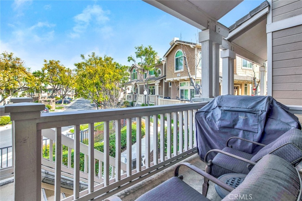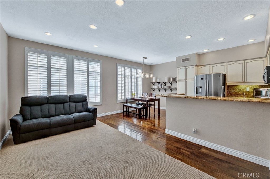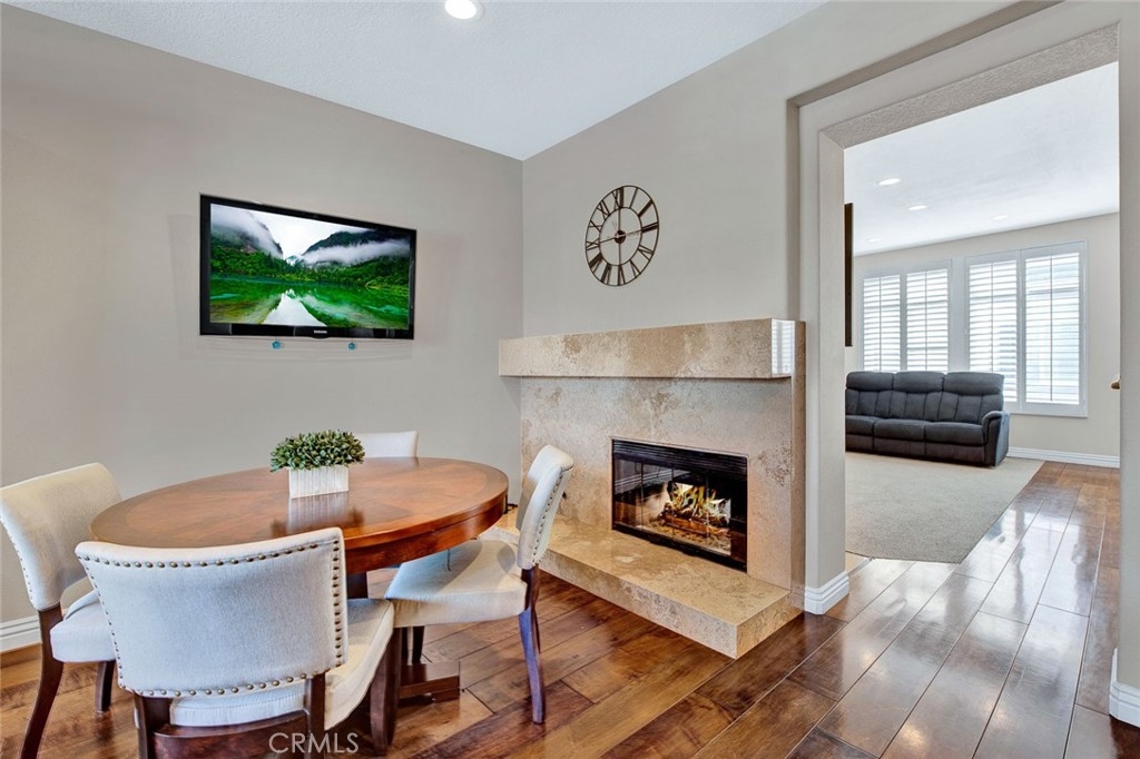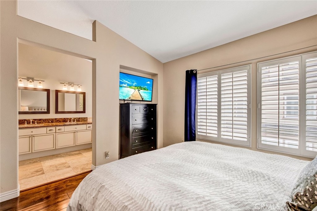 Fantastic 2 bedroom/2.5 bathroom floor plan in beautiful gated community! Very upgraded light & bright STUNNING HOME! Spacious living room w/marble fireplace. Gorgeous kitchen w/granite counters, breakfast counter, upgraded fixtures, water softener/purification system, stainless dishwasher, pantry & recessed lighting. Kitchen opens to family room w/nice built-in media niche & second marble fireplace. Custom wood flooring, plantation shutters & skylight. Downstairs 1/2 bathroom has granite counters & Kohler toilet. 3 car tandem garage w/Lift-master door opener, new semi-gloss paint, custom work bench & shelves, cabinetry, extra lighting & storage closet. Upstairs dual master bedrooms w/attached bathrooms. Master bedroom #1 has walk-in closet & custom nook. Attached master bathroom w/beautiful travertine, dual sinks, stone counters, shower & soaking tub, separate toilet room, shutters & linen cabinet. Second master bedroom has custom paint, mirrored closet door & attached bathroom w/custom cabinetry, granite counters, upgraded lighting, fixtures & Kohler toilet. Lennox HVAC unit! Pride of ownership! Enjoy 2 community pools & spas, clubhouse. Close to Grijalva park, Chapman University, shopping & more!
