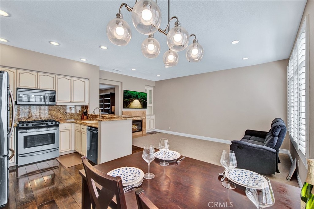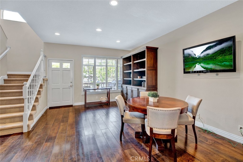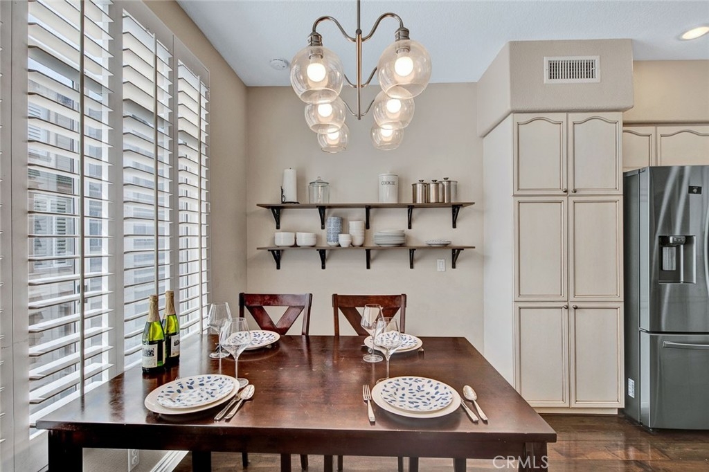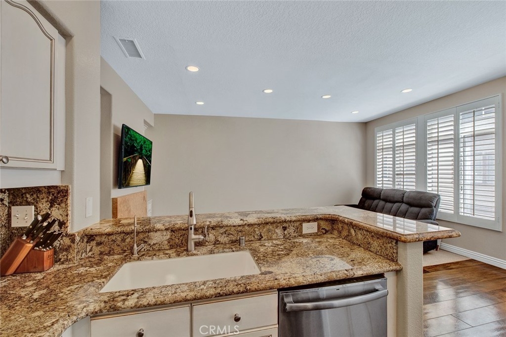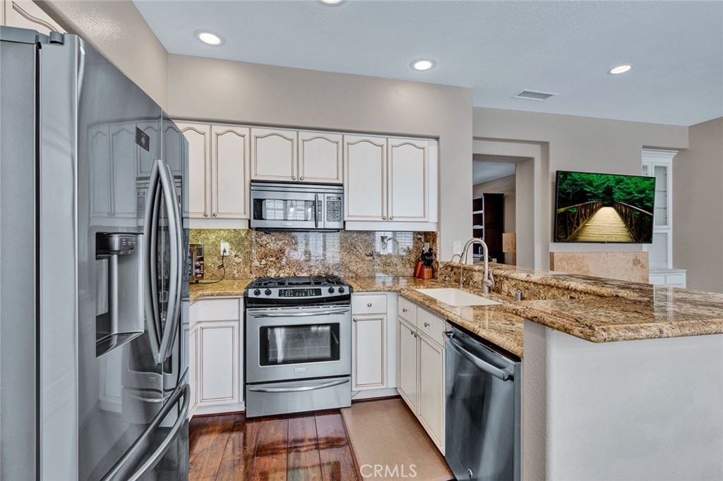 Fantastic 2 bedroom/2.5 bathroom floor plan in beautiful gated community! Very upgraded light & bright STUNNING HOME! Spacious living room w/marble fireplace. Gorgeous kitchen w/granite counters, breakfast counter, upgraded fixtures, water softener/purification system, stainless dishwasher, pantry & recessed lighting. Kitchen opens to family room w/nice built-in media niche & second marble fireplace. Custom wood flooring, plantation shutters & skylight. Downstairs 1/2 bathroom has granite counters & Kohler toilet. 3 car tandem garage w/Lift-master door opener, new semi-gloss paint, custom work bench & shelves, cabinetry, extra lighting & storage closet. Upstairs dual master bedrooms w/attached bathrooms. Master bedroom #1 has walk-in closet & custom nook. Attached master bathroom w/beautiful travertine, dual sinks, stone counters, shower & soaking tub, separate toilet room, shutters & linen cabinet. Second master bedroom has custom paint, mirrored closet door & attached bathroom w/custom cabinetry, granite counters, upgraded lighting, fixtures & Kohler toilet. Lennox HVAC unit! Pride of ownership! Enjoy 2 community pools & spas, clubhouse. Close to Grijalva park, Chapman University, shopping & more!