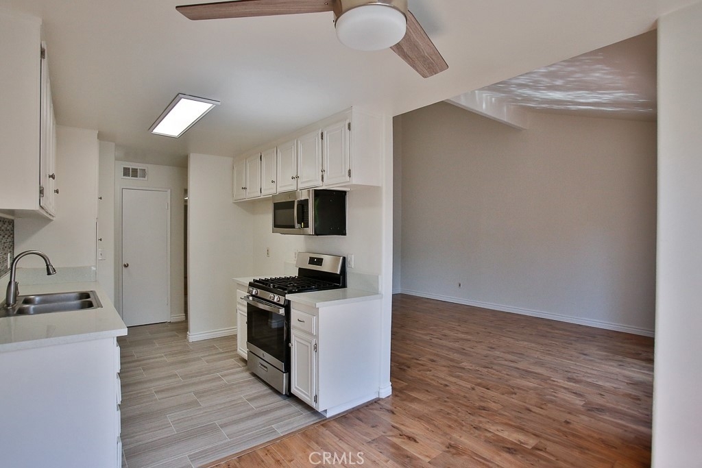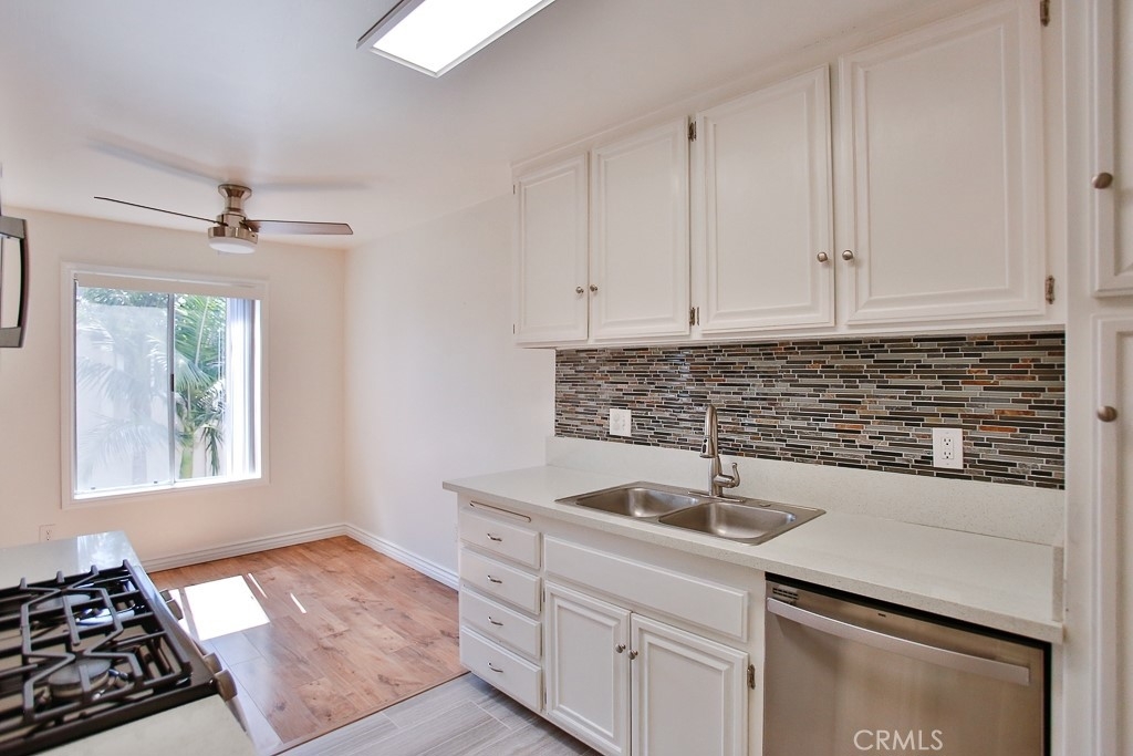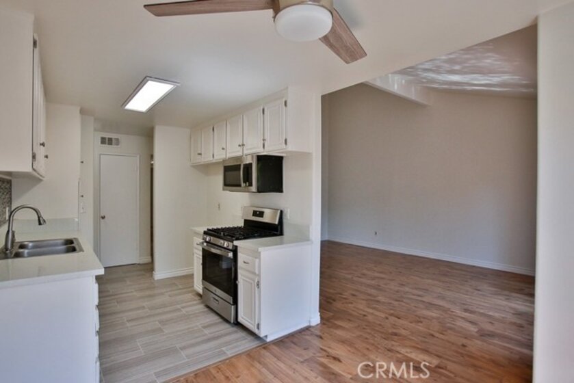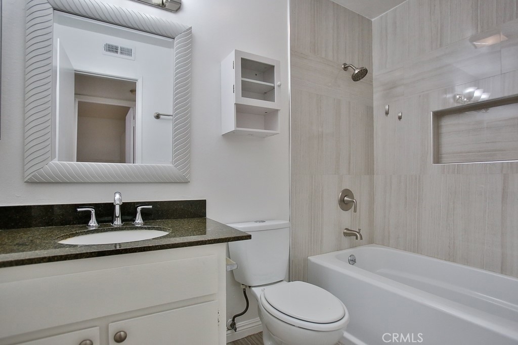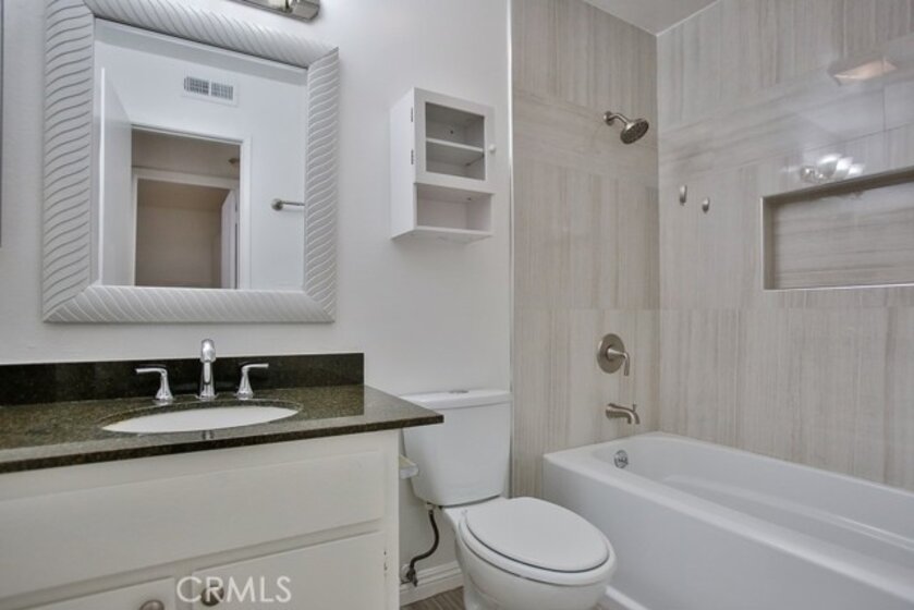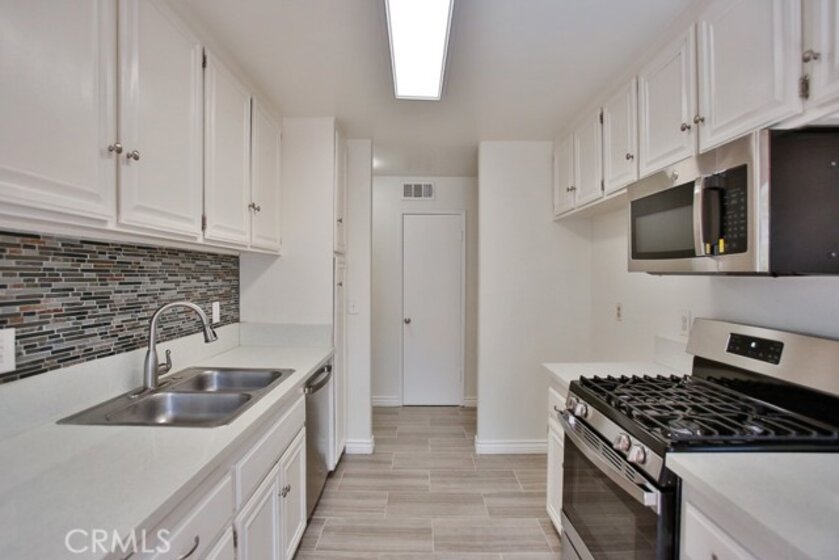 Fantastic Turnkey & Remodeled Upstairs unit within the desirable La Veta Monterey Community. This spacious, renovated, & move in ready upstairs unit offers 2 large size bedrooms & 2 fully remodeled bathrooms. The huge living room has laminate floors and vaulted ceiling with a balcony off the living area. The galley kitchen has new tile floors, quartz countertops, backsplash & brand new stainless steel appliances. With plenty of natural light, this unit also has central heat/AC, and walk-in closet. There are 2 parking spaces (one carport with storage and one assigned spot), and plenty of guest parking. The condo complex has two swimming pools, three laundry rooms, club-house, basketball court, playground, and HOA covers water, gas and trash. It is close to Main Place Mall, The Block, Disneyland, Great Wolf Lodge, Discovery Cube, is walking distance from hospitals including CHOC, and Saint Joseph, and conveniently located by the 5, 22, & 55 freeways. This is the perfect property waiting for that lucky owner!