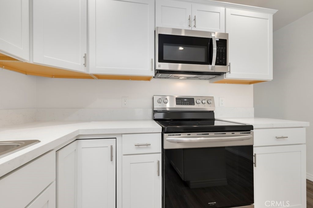 Completely remodeled condo located in the Park 72 neighborhood of Orange. Luxury vinyl plank floors and fresh paint throughout complement the bright and open floorplan. Enter into the inviting living room featuring a cozy fireplace. The neighboring kitchen is well-appointed with fresh white cabinets, quartz counters, stainless steel appliances, and a center island with breakfast counters that opens to the dining area. French doors open to the spacious back patio offering access to the shared garage. Down the hall, the master bedroom features dual closets and a luxurious en-suite master bathroom with a pedestal sink and walk-in shower. The secondary bedroom is generously sized and is adjacent to the full hall bathroom. Enjoy the nearby community pool. local shopping and dining options and freeway close!