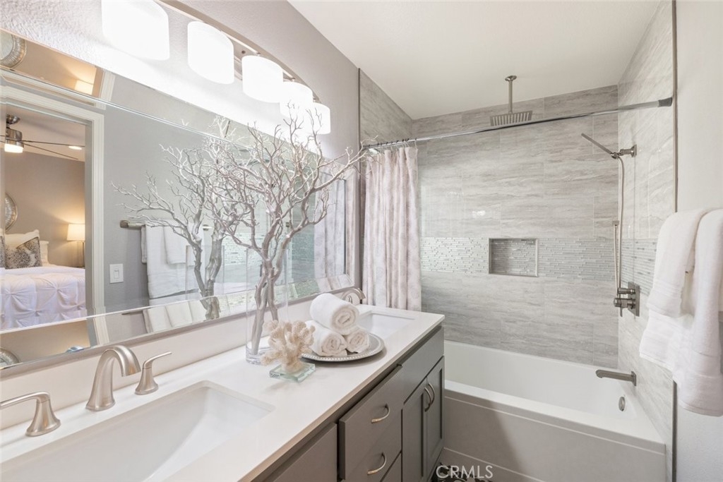 Remodeled and Highly Upgraded Executive Home. This immaculate spacious and bright 2 Bedroom, 2.5 Bath Townhome, is located in the highly coveted, guard gated community of Rocking Horse Ridge. The spacious and open floor plan offers a Family Room with gas fireplace and sliding glass door to the enclosed rear patio. Adjacent to the Family room is the Dining Area with a separate sliding glass door leading to the rear patio. The remodeled and upgraded gourmet kitchen includes designer counter tops and backsplash, cabinets, stainless steel appliances, and a breakfast bar. The private patio offers the perfect spot to relax, after a long bike ride, or day at work. Designer touches are found throughout the home including upgraded floors., fresh paint, and upgraded Decora outlets and switches. Adjacent to the main entrance, there is direct access to the two-car garage, with convenient laundry area, four ceiling mounted storage racks, and connections for a whole-house water softener. On the upper level, you will find dual master bedrooms, one with a built-in, cedar-lined storage bench below the window, a ceiling fan, and walk-in closet. The sliding barn door leads to the beautifully remodeled en-suite bath offering dual sinks, designer tile work, and a ceiling mounted rain shower in the tub/shower combo. The second Master Bedroom also offers a beautifully remodeled en-suite bath with walk-in shower, and spacious closet. The HOA includes 24-hour guard at the entrance gate, a crystal-clear swimming pool and spa, as well as a BBQ and picnic area. Located Close to schools, shopping, top-rated dining, and convenient freeway and toll-road access. A must see home, do not miss this incredible opportunity!!