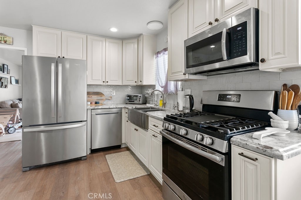 Absolutely gorgeous single-level, 2 bedroom, 2 bathroom, condo with nobody above or below. This home has everything you can hope for. As you enter, you are brought into the living room which boasts natural light, a tiled fireplace, and a slider leading to the private patio. The kitchen has been completely remodeled and suitable for the most discerning buyer. Light cabinetry with rustic hardware, granite counters, subway tile backsplash, farmhouse sink, stainless-steel appliances (including gas range), and a separate area perfect for prep/coffee station. The eat-in kitchen also can accommodate a large dining table. The master suite is generously sized and provides a large sliding mirrored closet and a barn door leading to the in-suite bath. The master bathroom has a custom tiled stand-up shower with glass surround, nickel fixtures, and added laundry area (featuring Samsung ventless dryer). The 2nd bedroom and full hall bath complete the floorplan. The outdoor patio space is accessed through the living room and provides a private spot for BBQs, and entertaining. Additional features include a 1-car detached garage, an assigned parking space (right outside your patio), warm vinyl plank flooring, recessed lighting, new ceiling fans/fixtures throughout, central heating and AC (including Nest thermostat), full-size, stackable laundry, scraped ceilings, and designer colors and finishes throughout. The association fee includes a community pool, laundry facilities, exterior maintenance and insurance, water, and trash. Easy access to freeways, restaurants, and shopping!