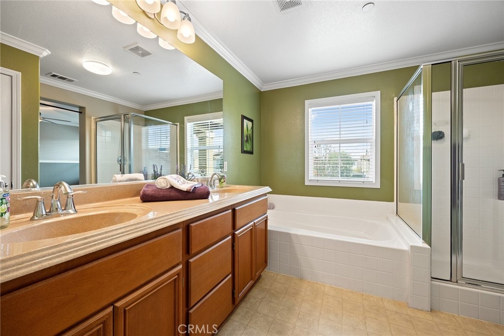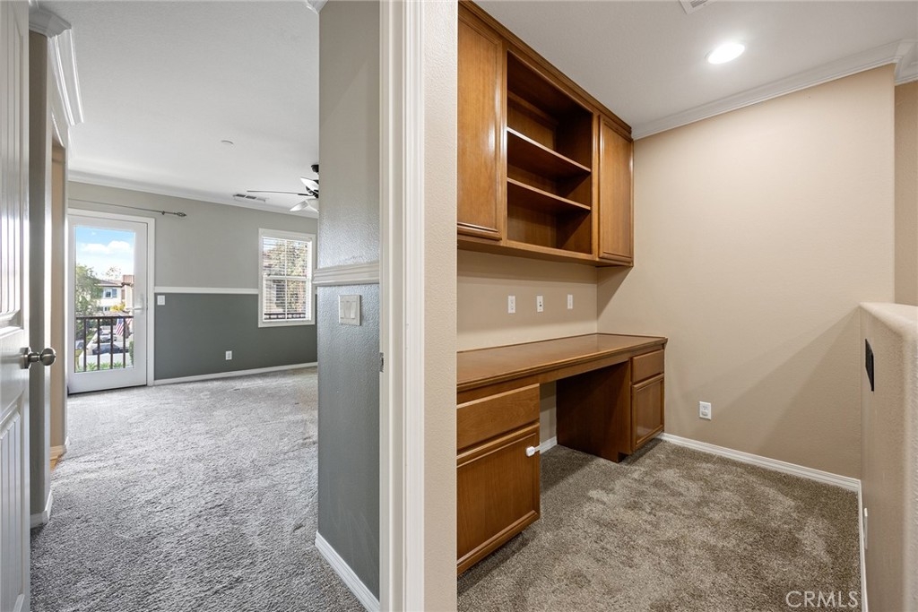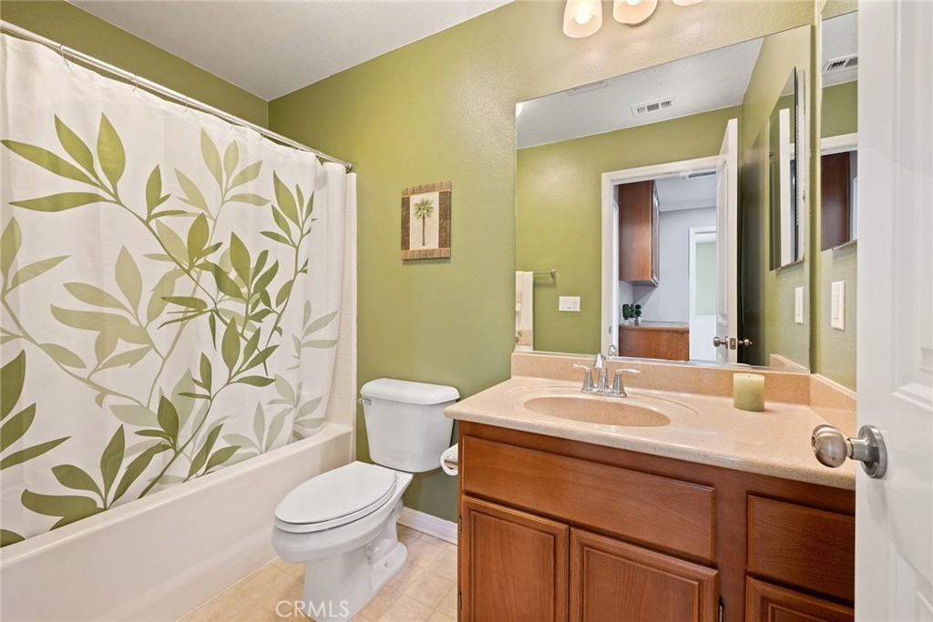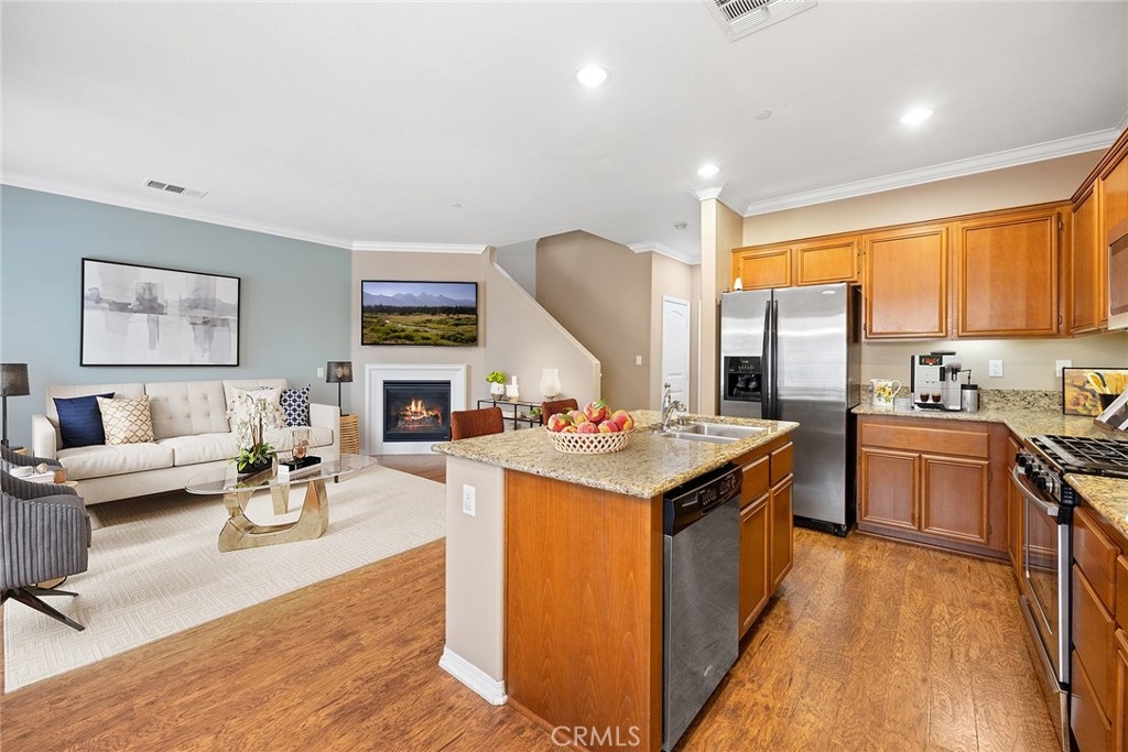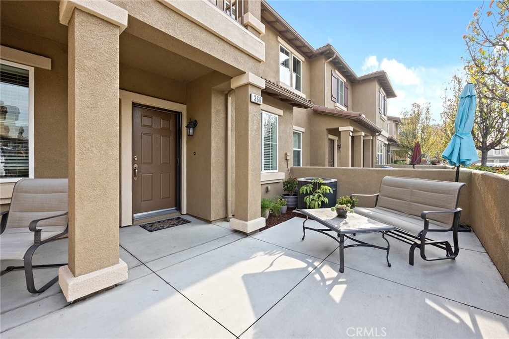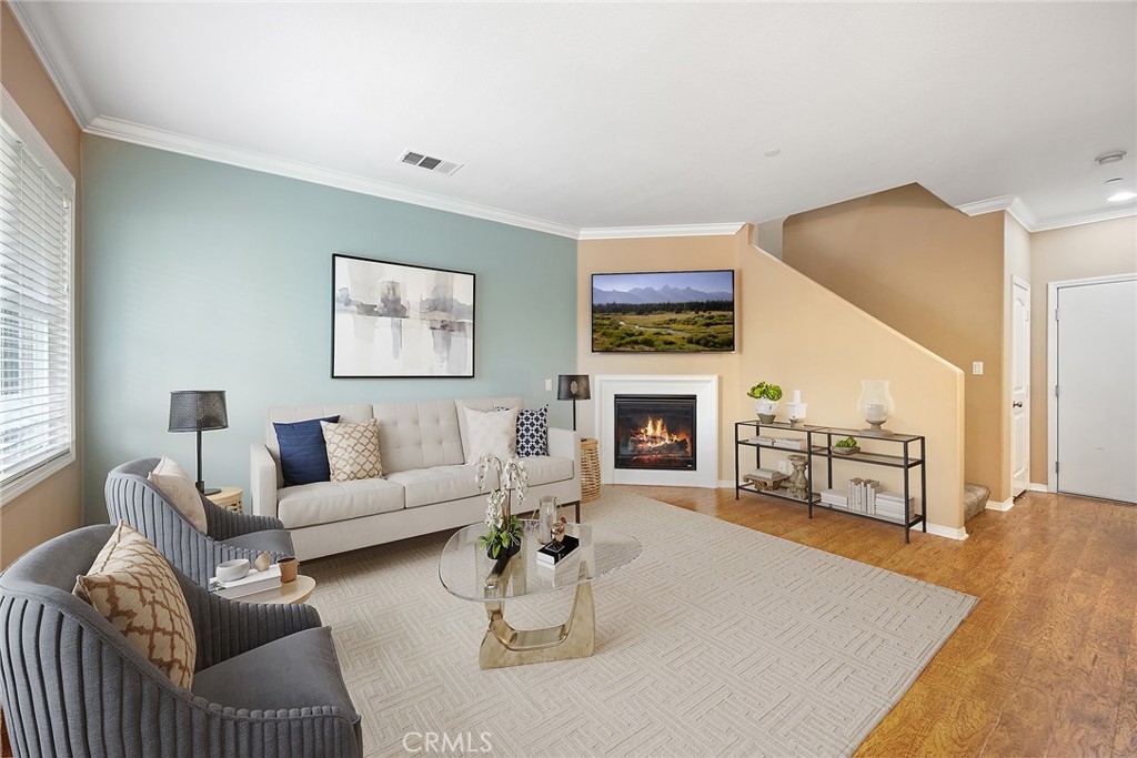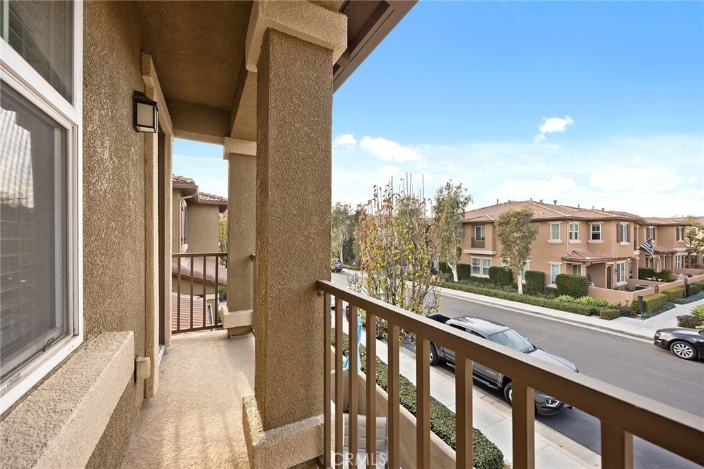 This home has it all and located in the highly sought-after Riverbend community! Enter through the private courtyard gate onto the sun-soaked enclosed patio ideal for expanding the versatility of this floorplan and entertaining family and friends. Be impressed as you enter with warm toned flooring, decorator wall tones, crown molding and pristine condition. Great floor plan with spacious living and dining room warmed by inviting fireplace and open to the upgraded kitchen with granite counters, large center bar island, stainless appliances, walk-in pantry and plentiful meal prep counters. A pretty powder room completes this lower level. Upstairs offers three spacious bedrooms plus an open loft/tech station with custom built desk as a real bonus. The primary bedroom suite includes an inviting balcony ideal for a relaxing morning cup of coffee, plus a generous bathroom with a soaking tub and separate shower, dual vanities and spacious walk-in closet. Two secondary bedrooms share the full hall bath along with upstairs laundry room for convenience. Direct access to an oversized two-car garage with epoxy flooring. Riverbend community features include a sparkling pool, relaxing spa, and basketball court, tennis court and playground area Super commuter location near freeways, schools, parks and favorite shopping. What more could you ask for?