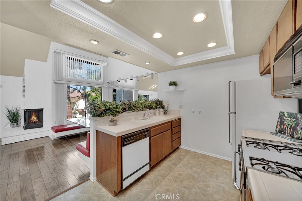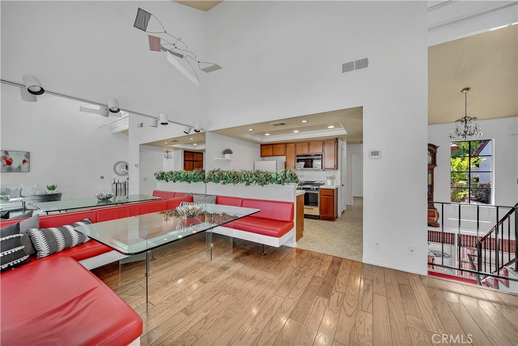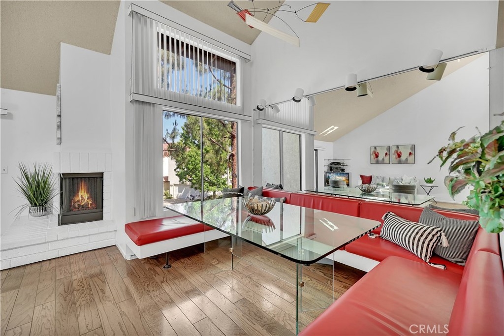 Rare opportunity to purchase a home in the Villa La Paloma Community! From the moment you walk into the front door, you’ll feel like you are up in the trees in an amazing tree house with views of the pine trees. A direct walk from the two car garage or driveway you enter the house on the second floor. This open concept main floor family room, dining room, kitchen and dry bar area has cathedral ceilings, picture windows, a gas fireplace and wood floors. The family room balcony faces west, has water and gas hookups for all those warm evenings to have a BBQ while enjoying the sunset with your family and friends. Down the short hallway is a full bathroom, secondary bedroom and laundry room area. Go down the red staircase with built in glass bookshelves on the landing to another secondary bedroom with a walk-in closet and en suite bathroom. The large master bedroom has dual closets with mirrored doors. The bathroom has a large countertop with two sinks and room for a vanity area and walk-in shower stall. Through the sliding glass door to your own private covered wrap around patio with wood fence & gate that opens to the community rolling hills greenbelt. Enjoy the quiet community with the large pool, deck area and spa.