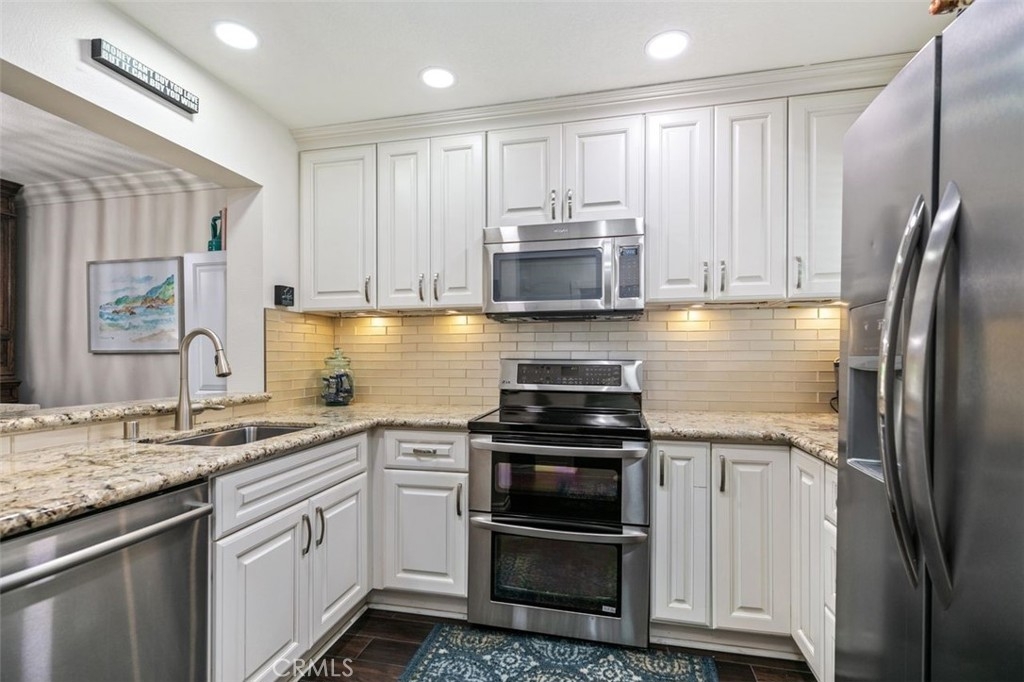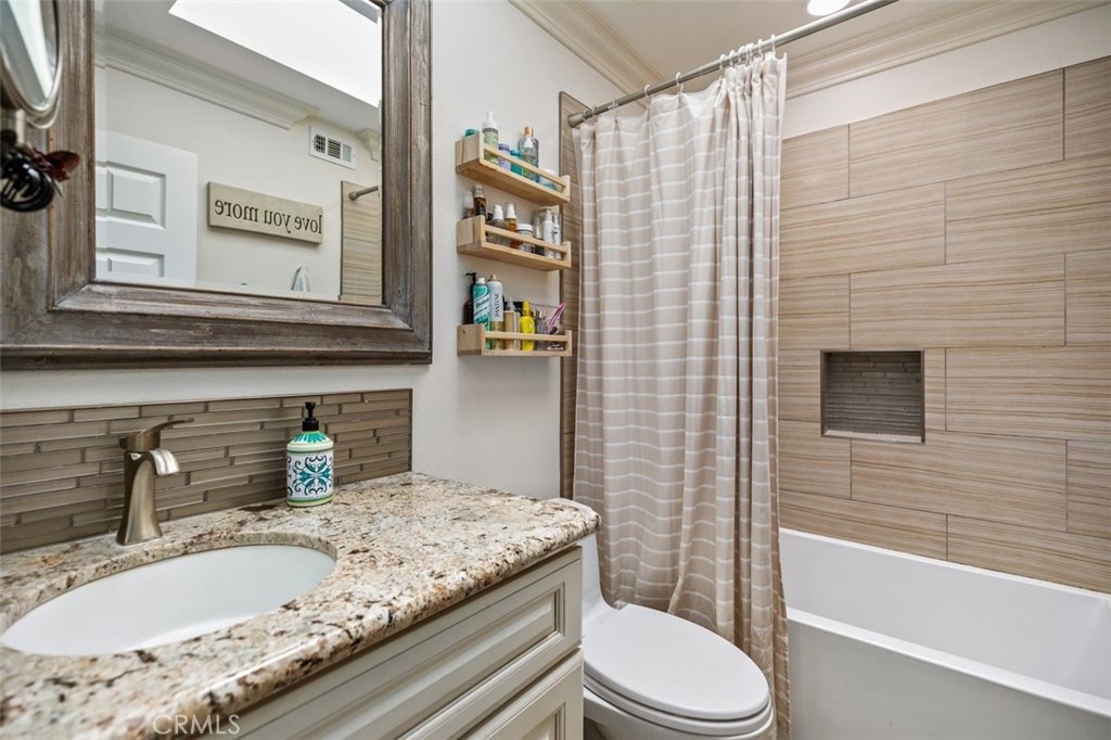 This beautifully remodeled condominium is located in the highly sought-after community of Villeurbanne in the City of Orange. This inviting home offers comfortable living space with two master bedrooms with full en-suite bathrooms, a powder bath downstairs, and in-unit laundry. As you enter the home, you are greeted by your upgraded kitchen with granite countertops, stainless steel appliances and newer cabinetry. The dining room opens up into the spacious family room with beautiful crown molding, porcelain wood flooring, a cozy fireplace and views of the private, enclosed patio. Completing the downstairs is a half powder bathroom and full size laundry. Upstairs, you will find sizeable dual master bedrooms with en-suite bathrooms. The master to the right of the stairs features a walk-in closet and a remodeled bathroom with a shower in tub combination. The master to the left of the stairs features a large, mirrored closet extending from wall to wall and a remodeled bathroom with a shower in tub combination. There is a one-car detached garage and two additional parking spaces. Additional upgrades include new dual pane windows, plantation shutters, newer HVAC and recessed lighting. The HOA pays trash and water. Enjoy the wonderful amenities that the Villeurbanne Association offers, including large grass areas, multiple pool and spa areas, and a clubhouse. Conveniently close to Blue Ribbon Award winning OUSD Schools, shopping, dining, and entertainment. Get anywhere quick with easy access to 55/22/5/57/91 freeways & The Toll Roads.