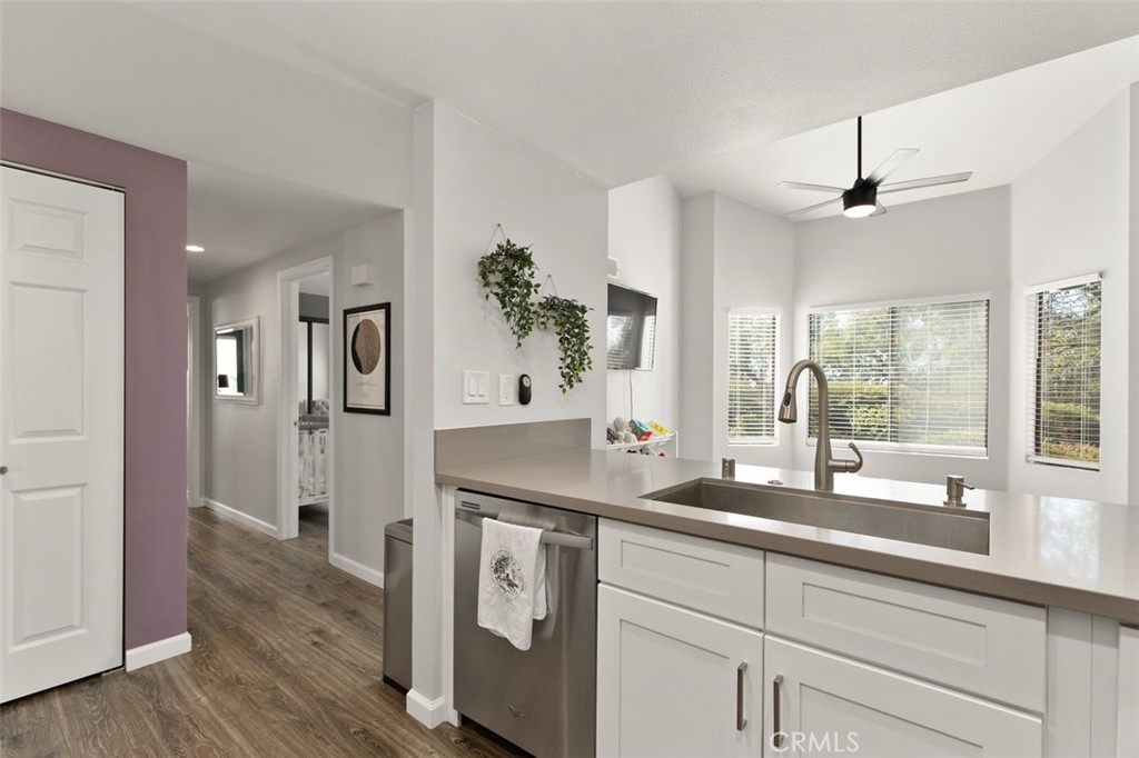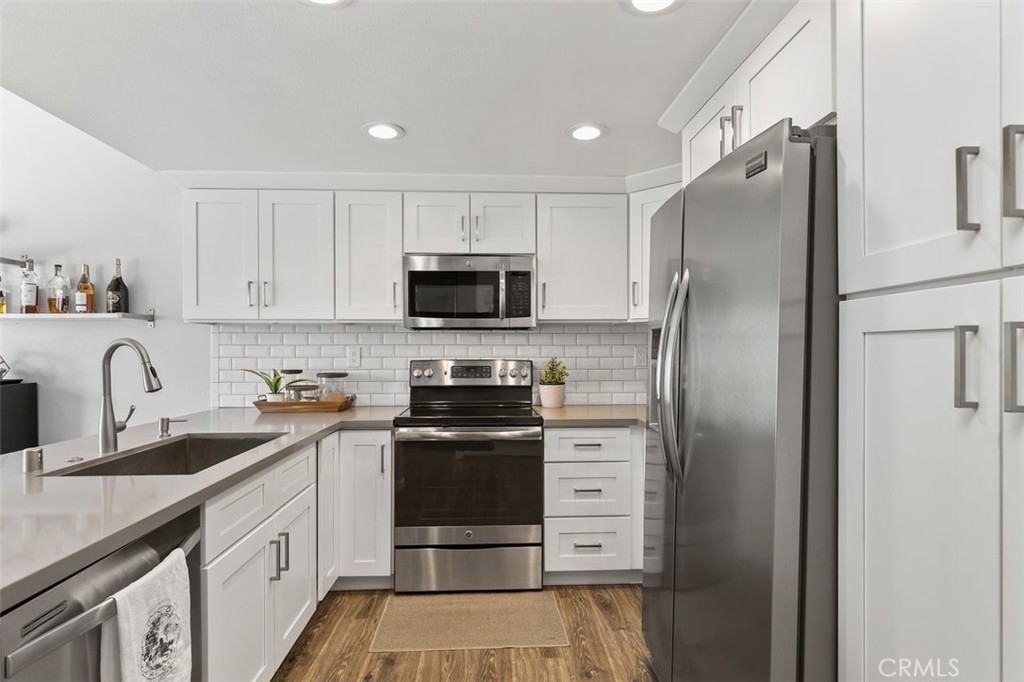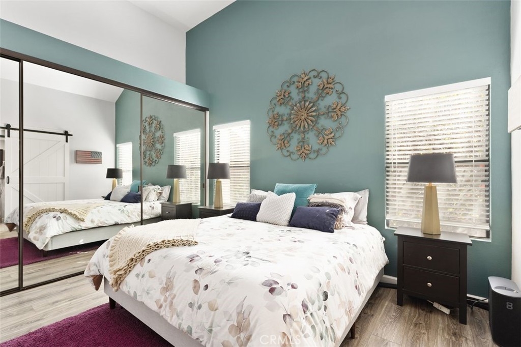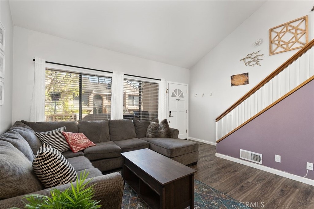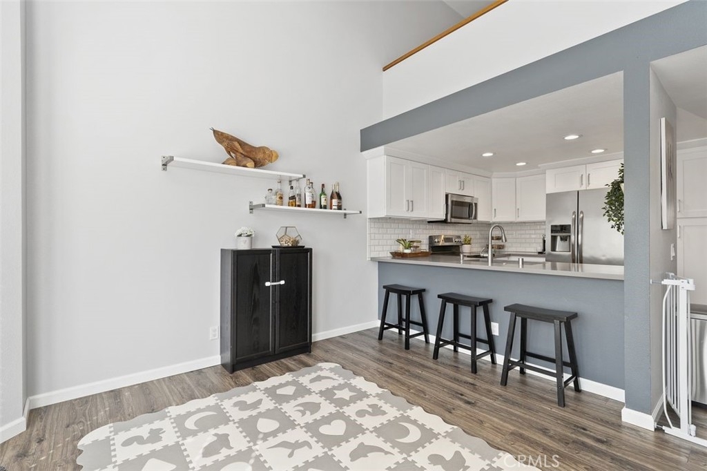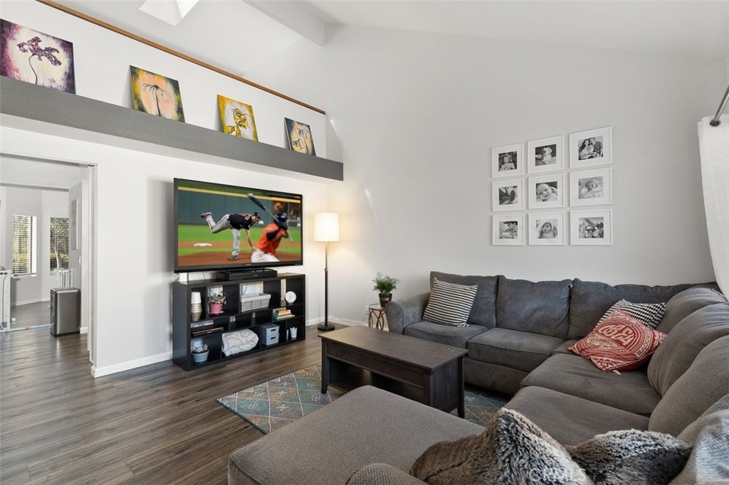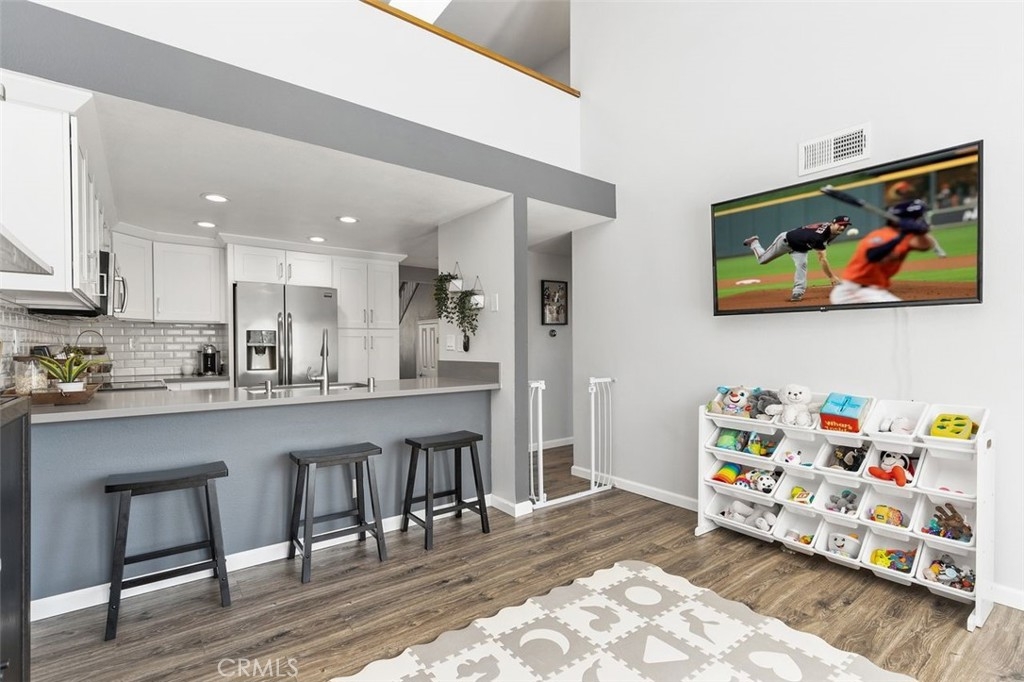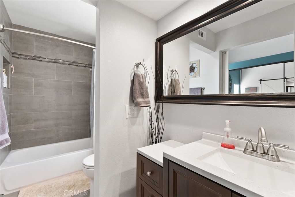 Gorgeously updated two story upper unit in the Canyon Glen community. Complete with two large bedrooms, two full bathrooms and an open loft this is the perfect space to call home. As you enter the home you are greeted by vaulted ceilings, an open living room and beautiful vinyl flooring. From the living room you enter into the updated kitchen where no detail was overlooked. Stunning white shaker cabinets with beveled subway tile backsplash and quartz countertops surrounded by stainless steel appliances create this dreamy kitchen. Off the kitchen is the dining area currently utilized as a family room. Down the hall you will find both bedrooms, the guest bath and inside laundry. The secondary bedroom is open with the continuous vaulted ceilings, tons of closet space and natural light. The guest bathroom has been beautifully updated with a single vanity with white countertops, tub in shower and detailed tile work. The master bedroom is the ultimate retreat with lots of closet space and ensuite master bath. Pass through the barn door into the wonderfully updated bath with single vanity and extra storage. Other features of this home include a 2 car garage with separate entrance, ceiling fans, inside laundry, front balcony and more. The community grounds feature large grass areas, and offers two pools and spa areas. Nearby El Modena trails, Irvine, Santiago Oaks and Peters Canyon Regional Parks. Conveniently close Award winning OUSD Schools, shopping, dining, and entertainment.