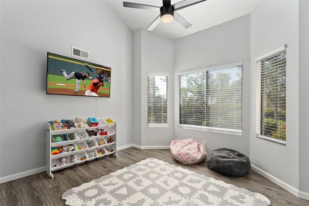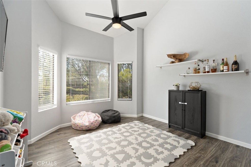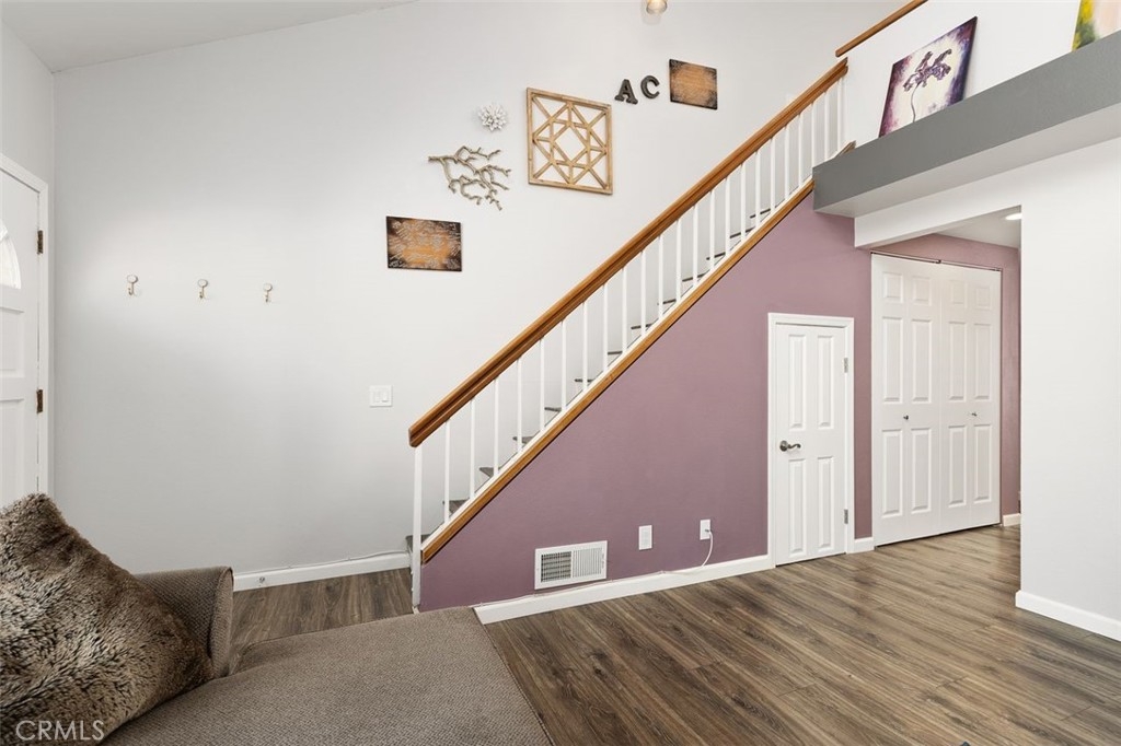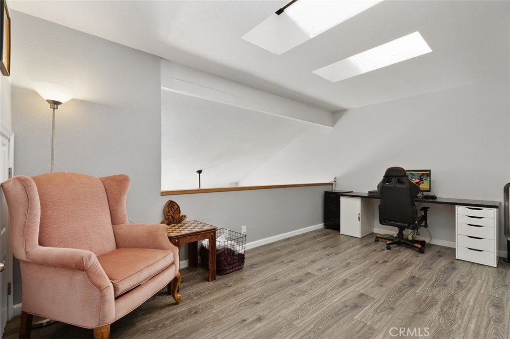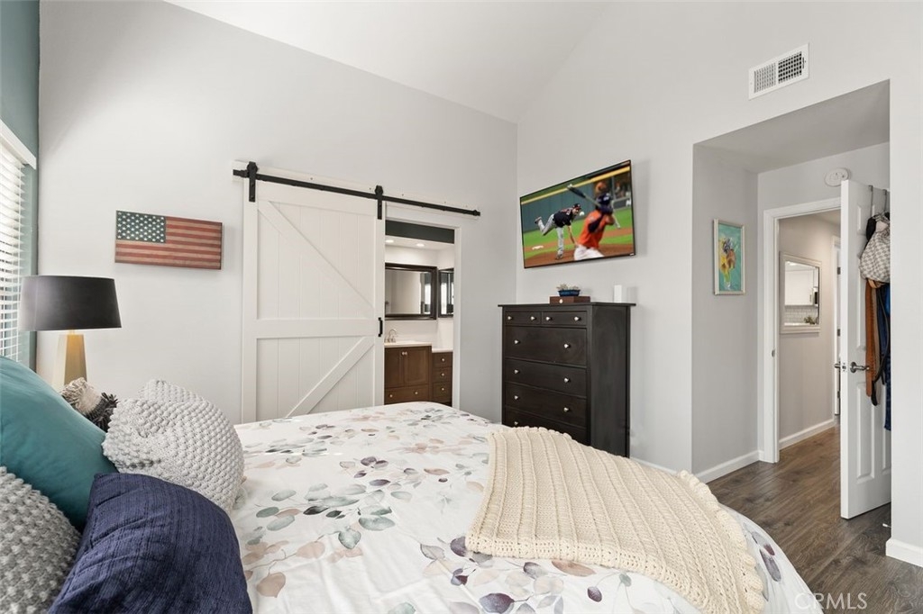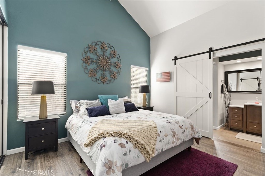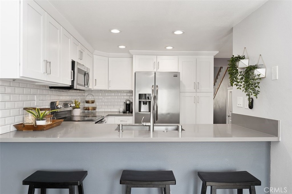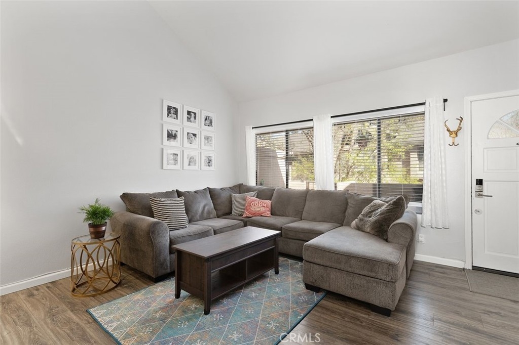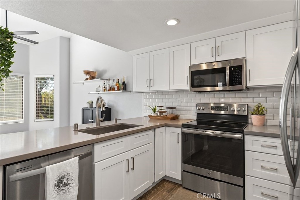Gorgeously updated two story upper unit in the Canyon Glen community. Complete with two large bedrooms, two full bathrooms and an open loft this is the perfect space to call home. As you enter the home you are greeted by vaulted ceilings, an open living room and beautiful vinyl flooring. From the living room you enter into the updated kitchen where no detail was overlooked. Stunning white shaker cabinets with beveled subway tile backsplash and quartz countertops surrounded by stainless steel appliances create this dreamy kitchen. Off the kitchen is the dining area currently utilized as a family room. Down the hall you will find both bedrooms, the guest bath and inside laundry. The secondary bedroom is open with the continuous vaulted ceilings, tons of closet space and natural light. The guest bathroom has been beautifully updated with a single vanity with white countertops, tub in shower and detailed tile work. The master bedroom is the ultimate retreat with lots of closet space and ensuite master bath. Pass through the barn door into the wonderfully updated bath with single vanity and extra storage. Other features of this home include a 2 car garage with separate entrance, ceiling fans, inside laundry, front balcony and more. The community grounds feature large grass areas, and offers two pools and spa areas. Nearby El Modena trails, Irvine, Santiago Oaks and Peters Canyon Regional Parks. Conveniently close Award winning OUSD Schools, shopping, dining, and entertainment.