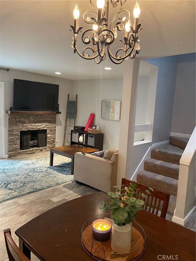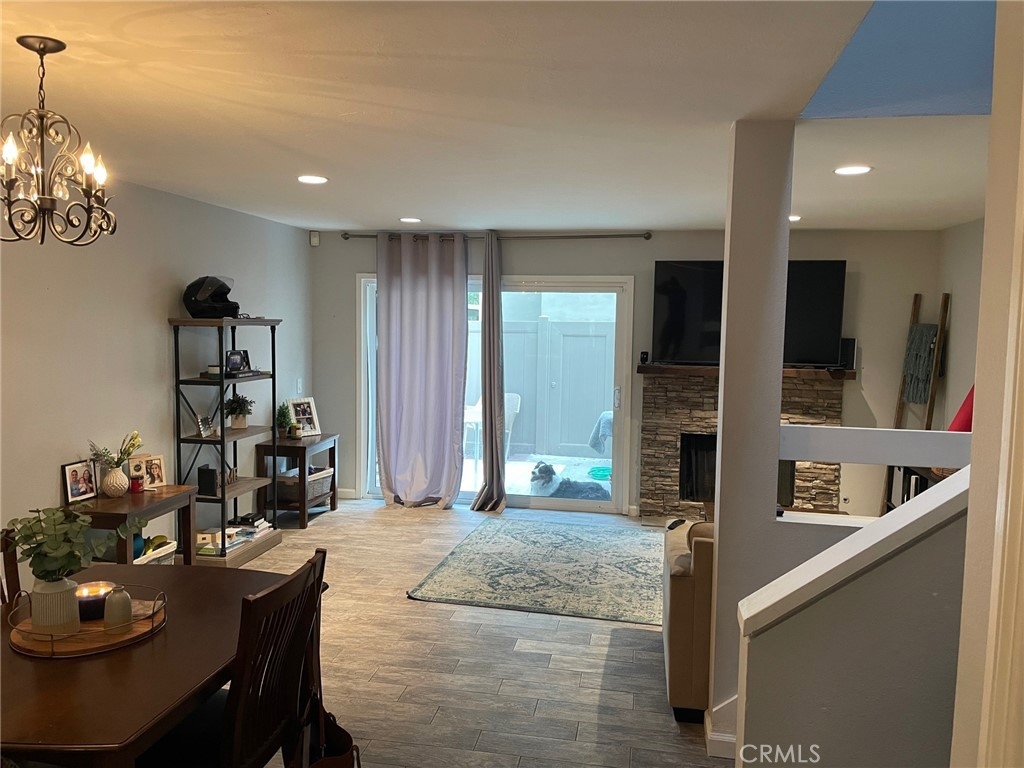 Gorgeous townhome is located on an amazing tree-lined street at Creekside in the Villeurbanne community. This homes shows like a well and priced to sell!. Kitchen features sparkling quartz counters and marble backsplash with stainless steel appliances and opens onto a large dining and living area. Beautifully rustic wood style tile flooring throughout lower level. Stack-stoned fireplace and rustic wood mantel. The downstairs powder room is also access to a full-size laundry closet complete with the convenience of additional storage. Upstairs features a light-catching skylight, plush neutral toned carpeting, and two generously sized bedrooms. The master bedroom is complete with large mirrored wardrobe doors and custom barn doors to divide the full hall bathroom. Nearby community pool and spa. The HOA includes water and trash. This home is conveniently close in proximity to fabulous shops, fine dining, and wonderful schools. Near beautiful Irvine Regional Park, Peters Canyon and wide open space for hiking make this a great opportunity!