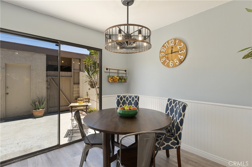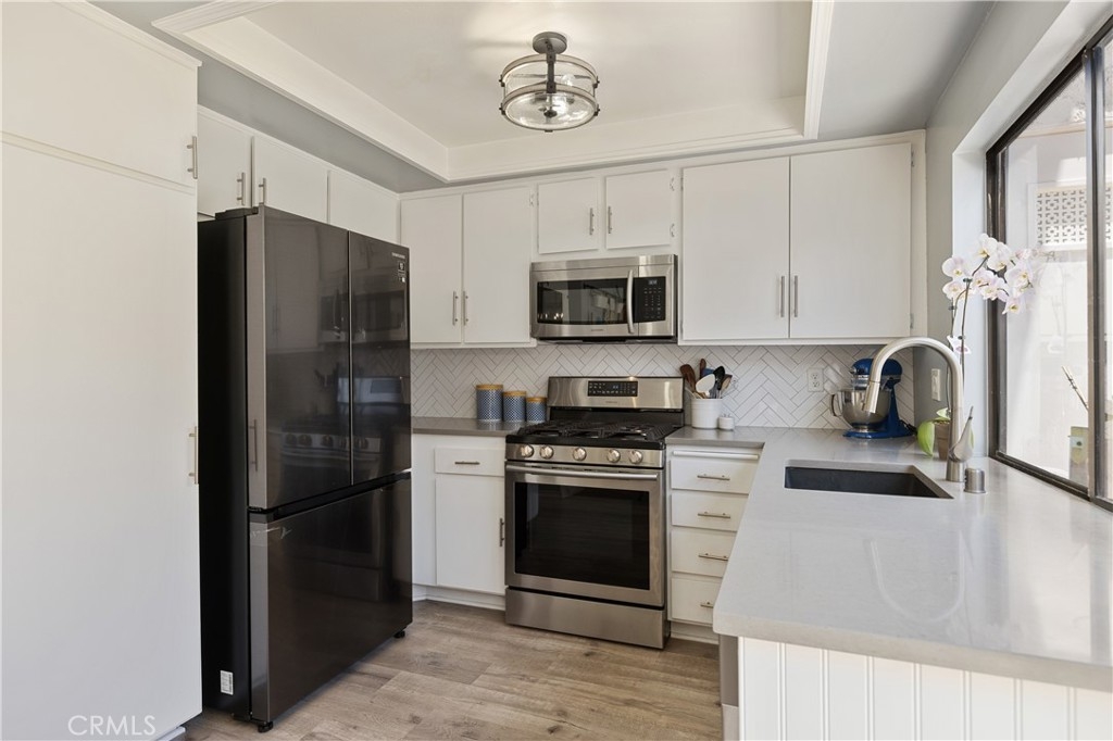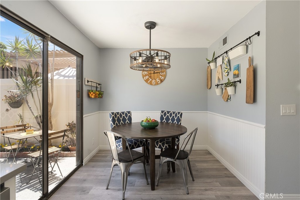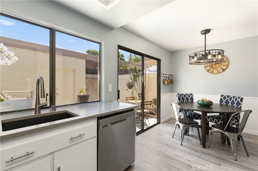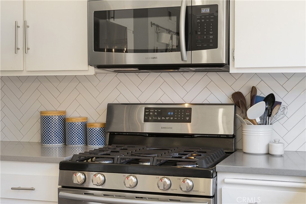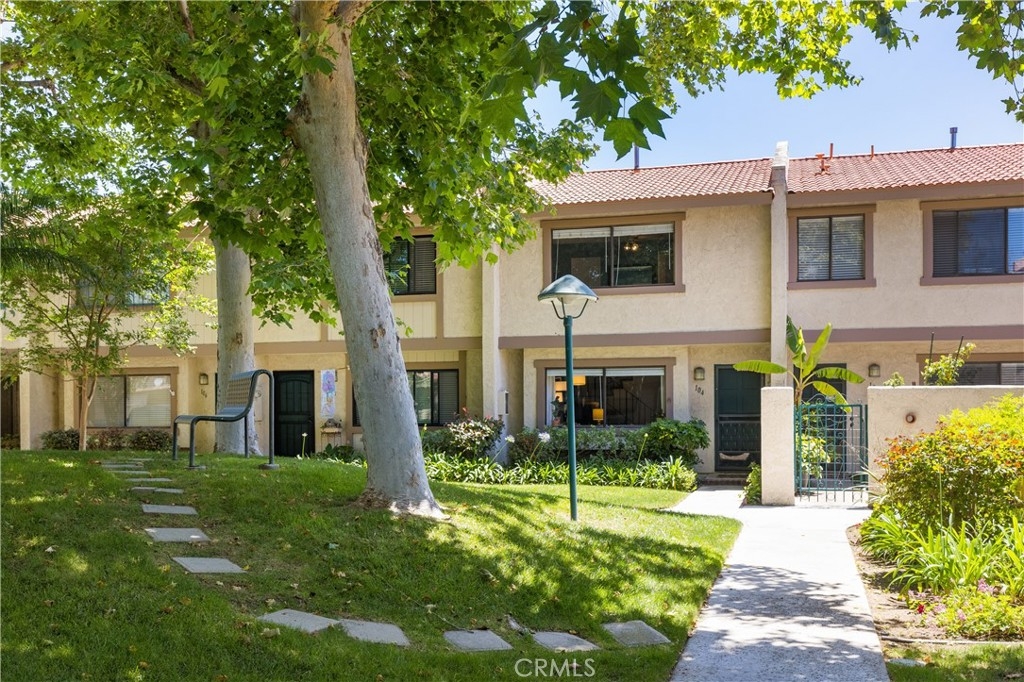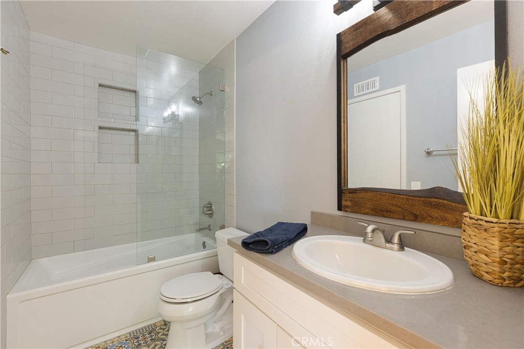 Welcome home to this beautifully updated condo in the gated community of Vista Monterey, located in the city of Orange. This interior unit has been thoughtfully remodeled with custom touches throughout. As you enter the family room, the cozy fireplace draws you in, with its Italian tile surround and reclaimed wood mantel. The custom built-in cabinet adds extra storage and counter space. Luxury laminate flooring throughout the first floor leads you to the kitchen, designed with white cabinets, quartz counters, and Samsung stainless steel appliances, including a new refrigerator. The adjoining breakfast nook includes wainscoting, custom lighting and a sliding door that leads to the sunny patio and the one car garage and carport. The remodeled powder room has custom white tile flooring, vanity, and new fixtures, with the washer and dryer conveniently tucked away (washer and dryer included too!). Upstairs are the two spacious bedrooms that share a completely remodeled bathroom with all new fixtures, bathtub, custom tilework, cabinetry, counters, lighting, and a whimsical tile flooring. The master bedroom has a separate remodeled vanity with custom finishes. Both bedrooms have custom ceiling fans with overhead lighting and ample storage with wall-to-wall closets. Newer HVAC system and water heater. The Vista Monterey community offers a relaxing pool and community multi-purpose space.