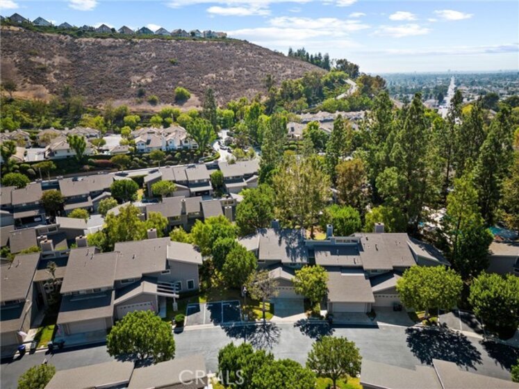 Tucked within the sought-after Chapman Townhomes community, this elegant end-unit townhouse-style address offers a rare blend of serenity and convenience, with a tranquil stream just beyond the private patio and rolling hill views as your daily backdrop. A dramatic double-door entry opens to soaring beamed ceilings, tall windows, and a light-filled open floor plan enhanced by brand-new high-end carpet and window shutters throughout, complemented by a sizable downstairs office or bonus room plus 3 generously sized bedrooms upstairs. The kitchen is thoughtfully appointed with stainless steel appliances, a gas cooktop, breakfast bar, and included refrigerator. The spacious primary suite features a walk-in closet, dual vanities, a sit-down makeup station, and glass-enclosed shower. A newly remodeled secondary bathroom adds a fresh, modern touch. Additional highlights include laundry appliances, an attached direct-access garage, and ample guest parking. Canyon Hills is known for its winding ponds and streams, resort-style pool and spa, and tennis courts, all just minutes from Old Towne Orange, local shopping and dining, major freeways, and nearby parks and trails, making this home as convenient as it is captivating.