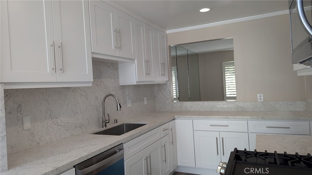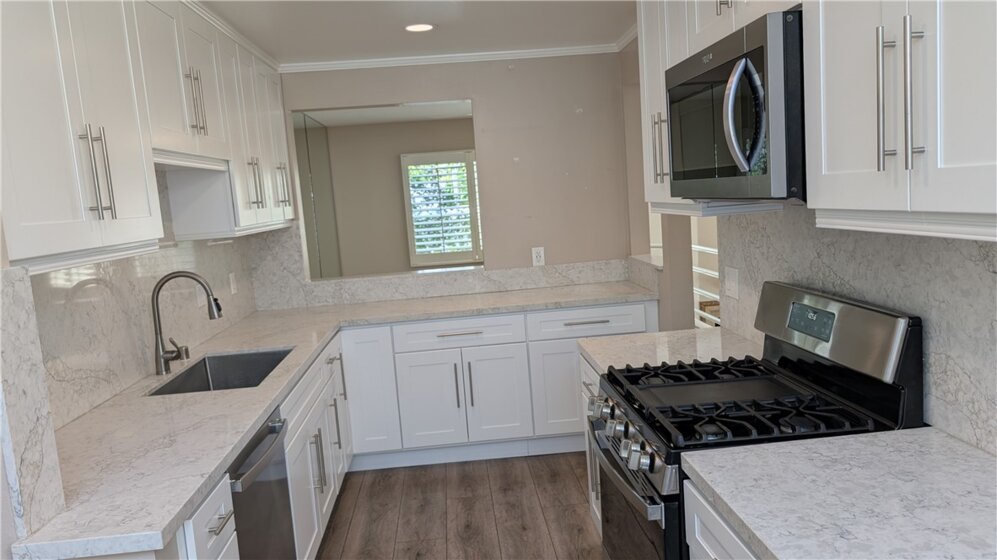 Wow! Must see this Upgraded and contemporary condo in the hills of Orange. Premium end unit/interior location at end of cul de sac (no close neighbors behind or in front). Recently installed gorgeous premium flooring throughout. Lots of windows, high ceilings, skylight, upgraded LED lighting, plantation shutters. Remodeled fireplace, formal dining room(can be used as office). Gorgeous remodeled kitchen(2024) offering premium stainless steel appliances including gas cook top/oven, microwave, quartz counter tops, lazy Susan, self closing cabinets and breakfast area-A Chef's dream. Huge master suite offering own private patio, Stunning remodeled (2024) walk in shower, vanity cabinetry with LED mirror. Relax to soothing sounds of adjacent stream flowing along entire rear of property. Full size indoor laundry room with new cabinet. Recently Re-piped with PEX. Tons of storage include huge storage area off stairwell. Enjoy access to two community pool and spas including a club house and barbeques. Wonderful greenbelts, trees and streams throughout the Stream House community perfect for dog walks. Enjoy Paved walking/bike trails across the street along with hiking trails. Also enjoy within minutes by car-Peter's Canyon, Irvine Regional Park and toll roads.