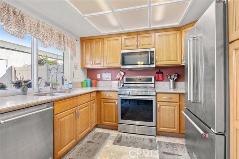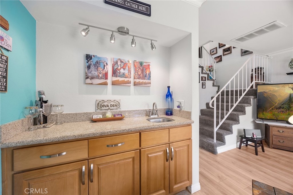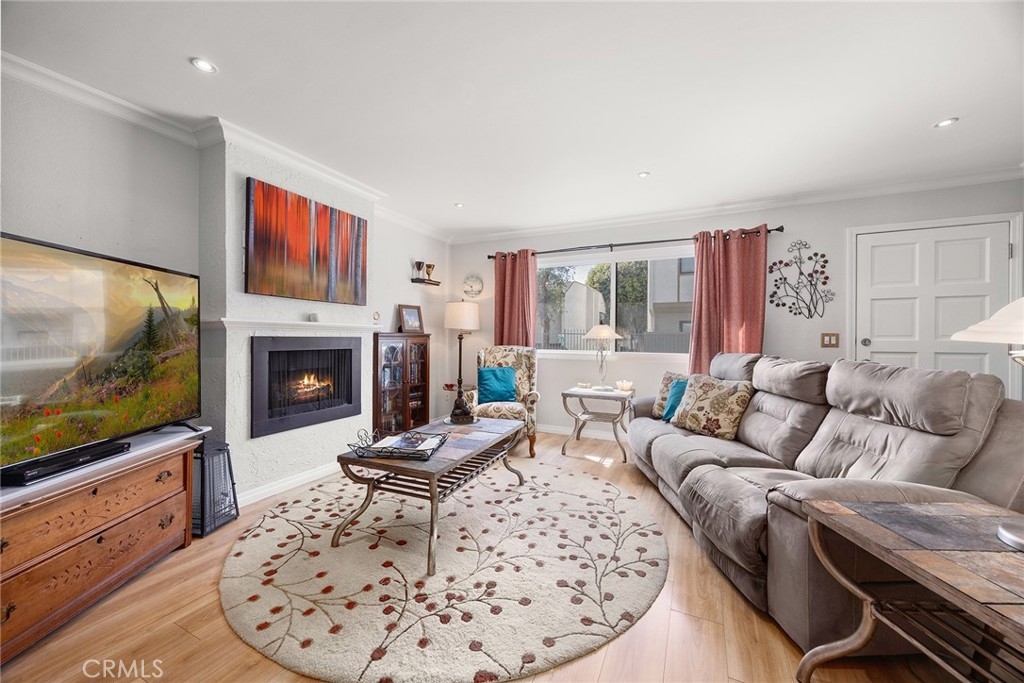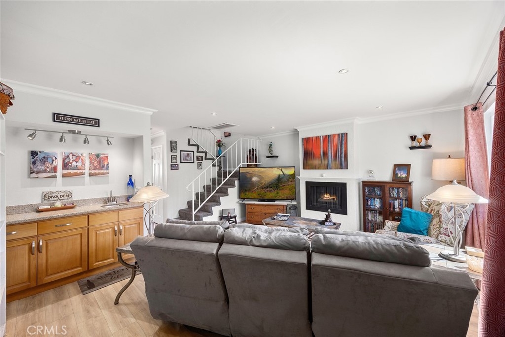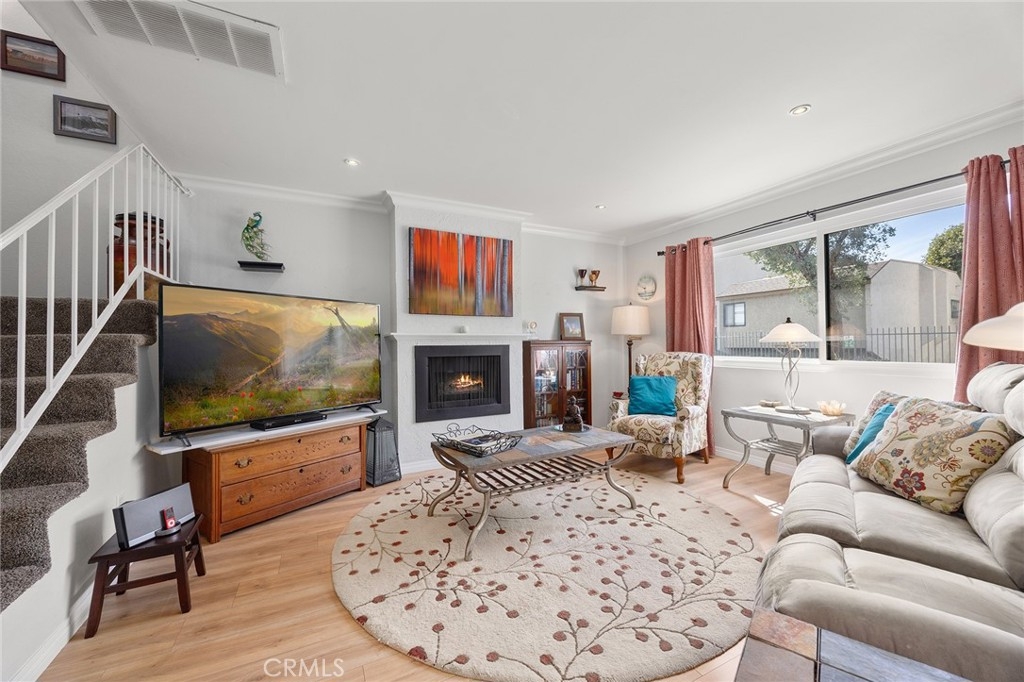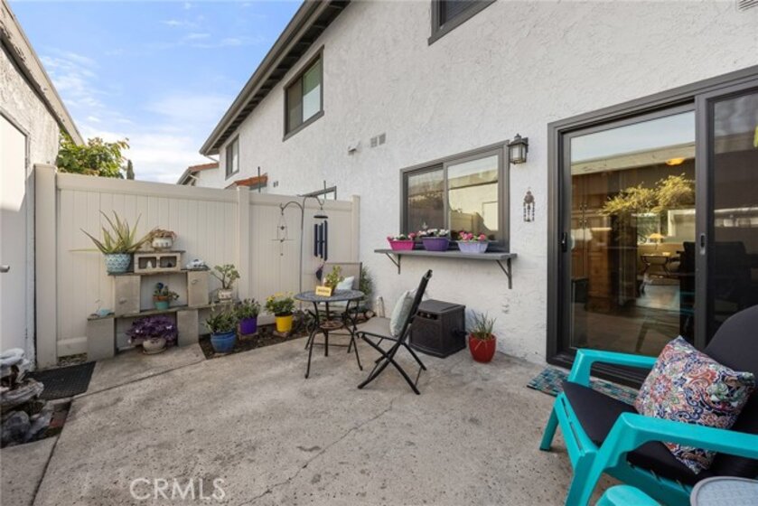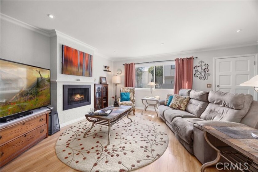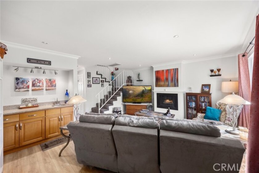 I am excited to introduce you to this delightful 2-bedroom, 1.5-bathroom residence in a quiet, tree-lined neighborhood in the heart of Orange. This home offers 1,190 square feet of comfortable living space with a functional and well-designed layout in a desirable community. Step inside to find beautiful laminate wood and tile flooring throughout and a spacious living area featuring a cozy fireplace, perfect for relaxing evenings at home. The adjacent bar area adds charm and versatility, ideal for entertaining guests or creating your own stylish beverage station. The kitchen and dining area flow seamlessly to a cute private patio, offering the perfect spot for morning coffee, outdoor dining, or unwinding after a long day. Upstairs, you'll find two carpeted and generously sized bedrooms along with a full bathroom, providing privacy and separation from the main living areas. The convenient downstairs bathroom also includes the laundry area with hookups, adding everyday practicality and efficiency. Additional highlights include a one-car garage and a covered carport space, offering ample parking and extra storage options. Centrally located with close proximity to shopping, dining, and freeway access, this home blends comfort, convenience, and charm. Don't miss the opportunity to make this wonderful property your own!