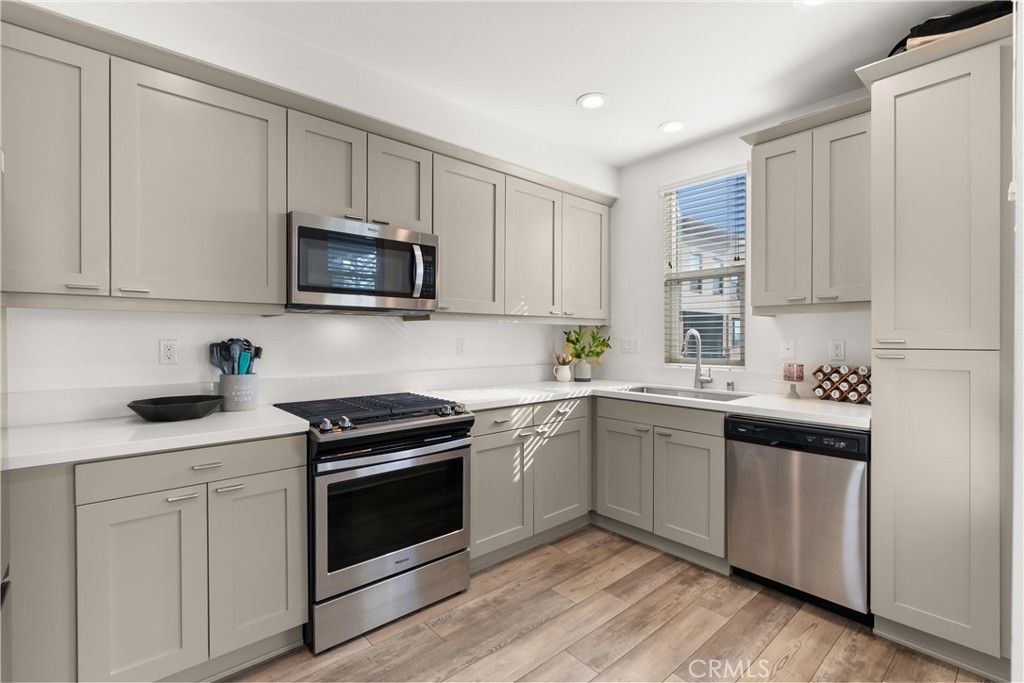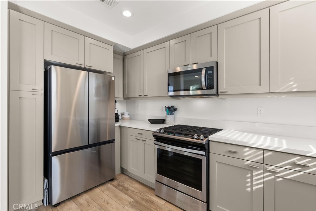 Welcome to this bright and modern end-unit townhome built in 2020, offering the perfect blend of modern design, comfort, and convenience. This beautifully appointed tri-level 2 bedroom, 2.5 bathroom home features an open-concept layout ideal for both everyday living and entertaining. The first level offers direct access from your 2-car attached garage, making daily life convenient and secure. This unit features a rare driveway space that allows for a 3rd car parking The second level showcases a bright and spacious great room with large windows and abundant natural light flowing into the living and dining areas. The contemporary kitchen is equipped with sleek cabinetry, quartz countertops, and stainless steel appliances. A private balcony, in-unit laundry, and a modern half bath complete this level. Ascend to the third level and discover the primary suite featuring a spacious layout, dual vanities, and a walk-in shower. The secondary bedroom has convenient access to the hallway second bath. This well maintained newer construction community offers convenient access just minutes from shopping, dining, freeways, and vibrant Old Towne Orange. This move-in ready condo is a rare opportunity to own a newer home in one of Orange County’s most desirable locations!
