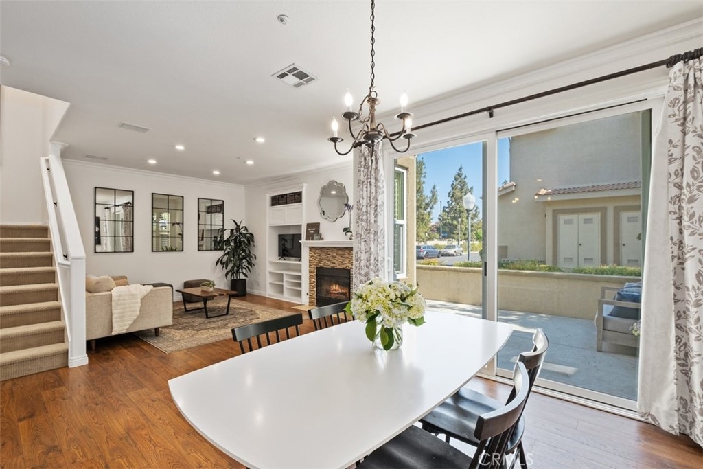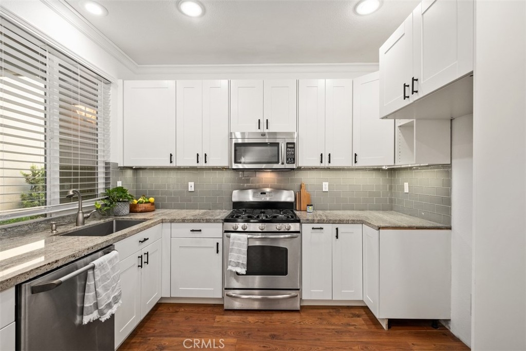 Nestled in the gated community of Cambridge Creek in Orange, this beautiful turnkey home has an ideal interior location only steps away from the refreshing community pool. The home features 3 spacious upstairs bedrooms, 2.5 bathrooms, an upstairs loft, and approx. 1,700sf of living space. Enter the home into the spacious living and dining areas, where the fireplace with mosaic tile surround and wood mantle, is the centerpiece of the room. The premium laminate floors, upgraded baseboards, crown moldings, and built-in media niche complement the room. The open floorplan is perfect for entertaining family and friends or just everyday living. Over-sized sliding door in the dining area opens to spacious patio area, extending your indoor living outdoors. The remodeled kitchen features updated shaker white wood cabinetry, granite counters, mosaic tile backsplash, and stainless steel appliances. A separate laundry room & powder room complete the main level. Upstairs, the master suite features crown molding & ceiling fan. Remodeled master bath offers updated dual vanities and sinks, separate tub & shower, as well as a large walk-in closet with built-ins. Large secondary bedrooms are separate from the master, offering the utmost in privacy. Open loft area is perfect for home office, den or playroom. Updated hall bath completes the second level. Other upgrades include new Milgard windows, ceiling fans, recessed lights throughout, upgraded upstairs carpet, and custom paint. The direct access two-car garage has an abundance of built-in storage, epoxy flooring, and a water softener system. Centrally located with a short walk to the nearby Grijalva Park and Sports Complex and to Prospect Elementary School and El Modena High School and close to shopping and the freeways. No Mello Roos and low HOA of $260/mo. A great place to call home!