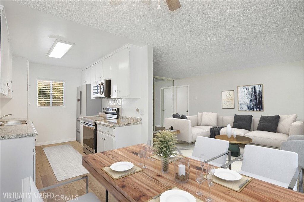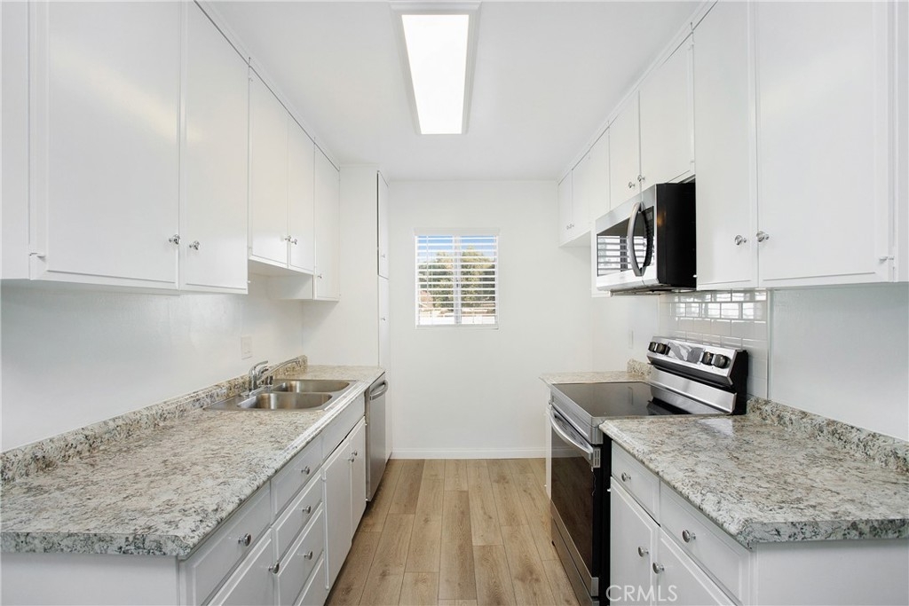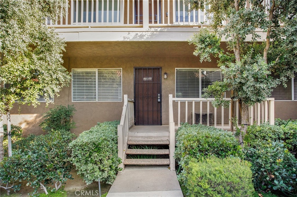 Downstairs end unit with a front porch overlooking the" park like" greenbelt area. This unit has been renovated including new stainless steel kitchen appliances and countertops. The bathroom has a new tub/shower with subway tile surround. New bathroom vanity with cultured stone countertop. Freshly painted throughout with new luxury vinyl flooring and carpeting. Lot's of storage inside the condo and in the single car garage. The community property includes a pool, greenbelt area, BBQ area, clubhouse and laundry facility. Great location. Walk to Old Towne Orange and Santiago Nature Creek Park. Chapman College, CHOC, St Joseph Hospital and UCI are close by. Freeway close to the 22, 55 and 5.