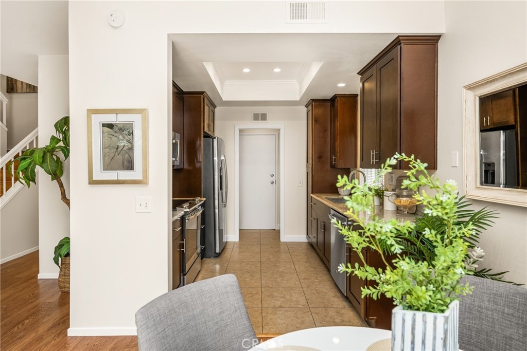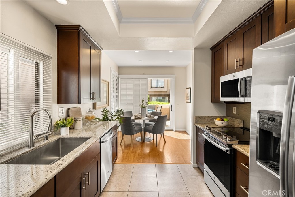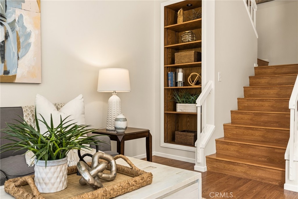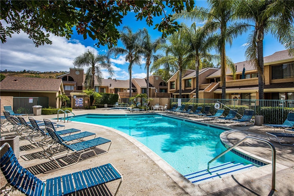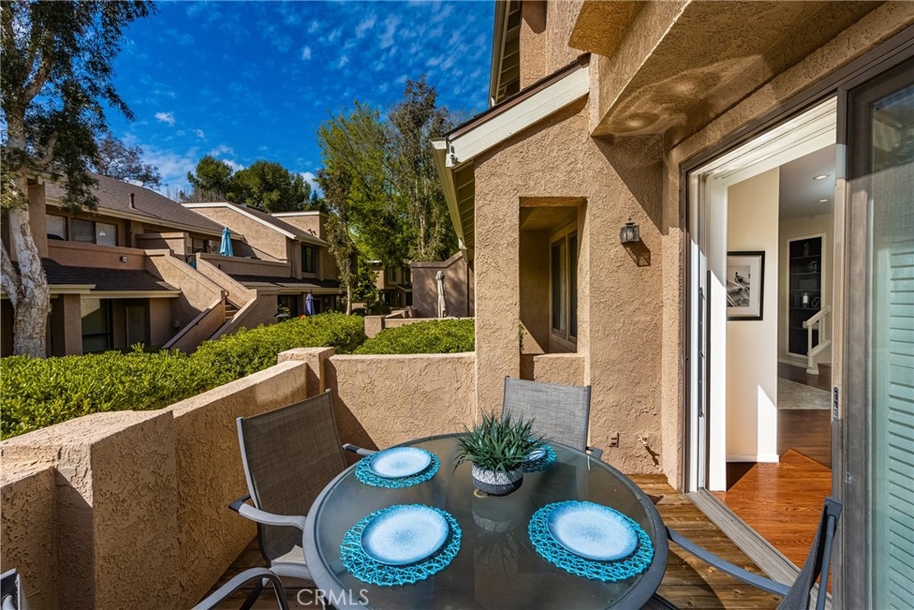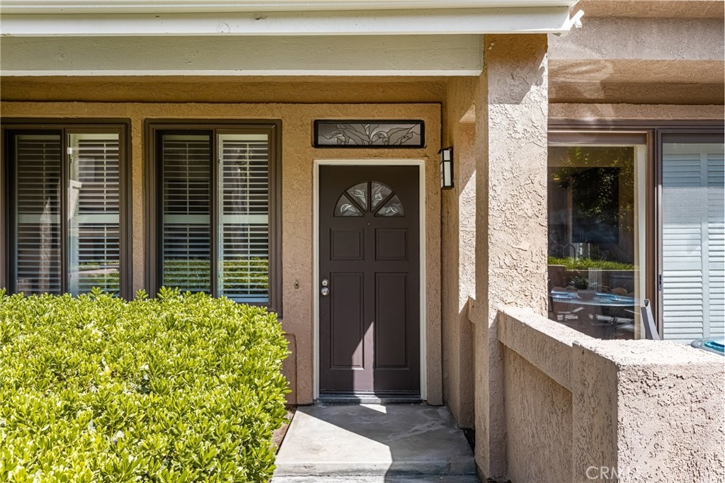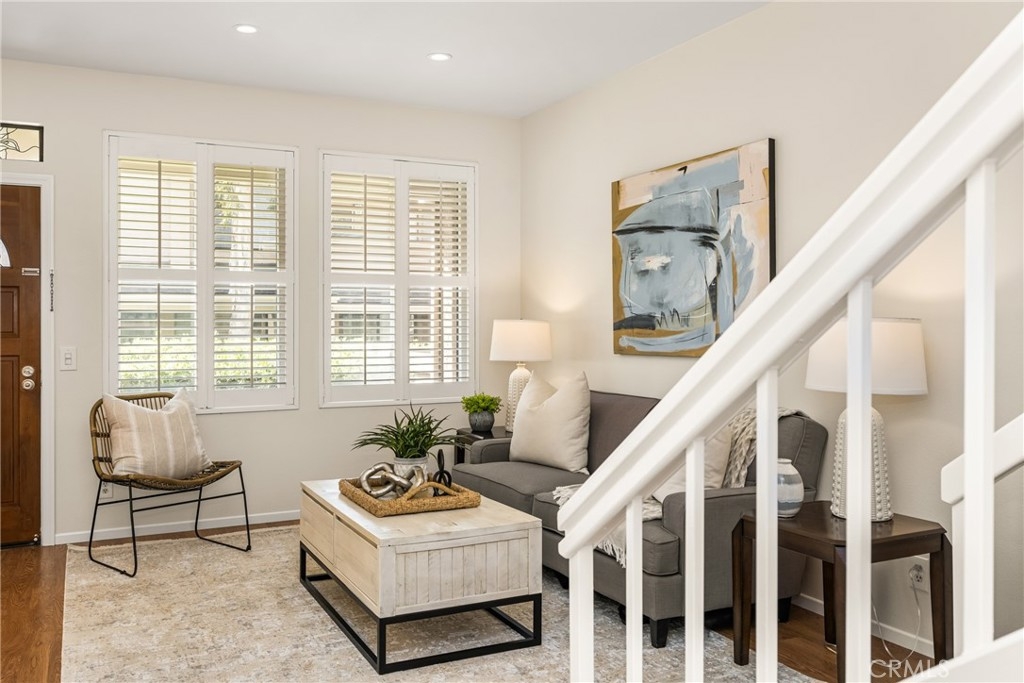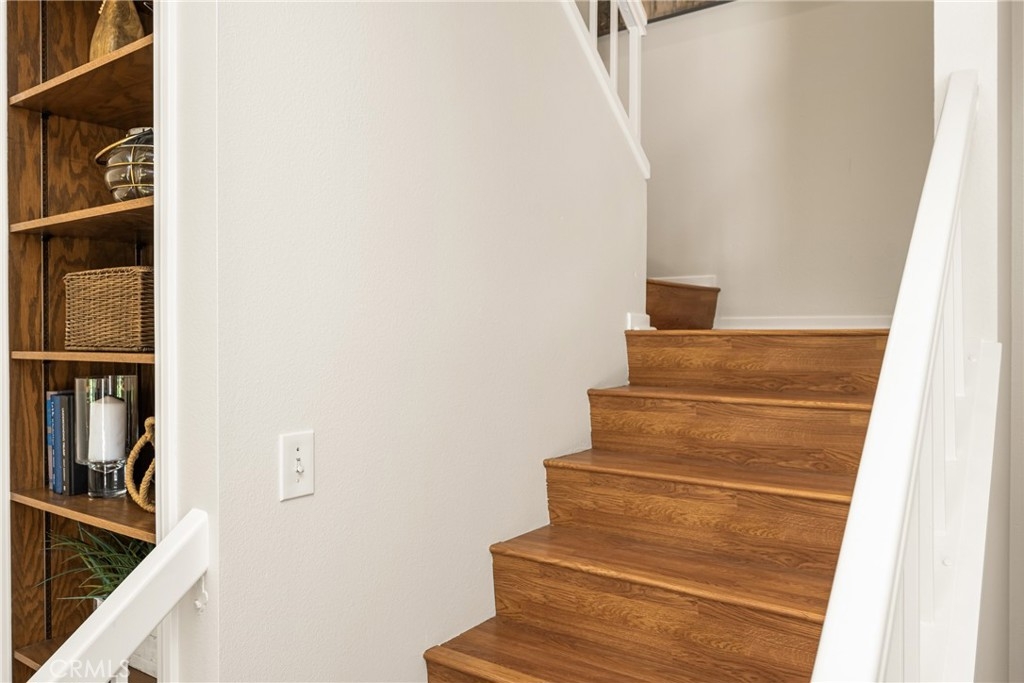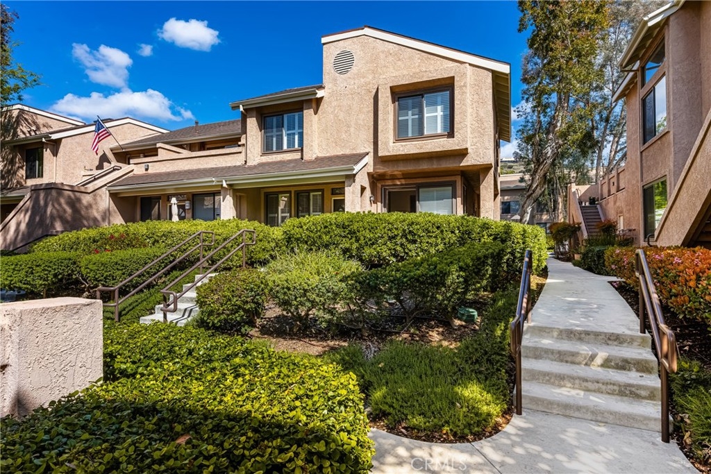 Nestled in the East Orange Foothills, this remodeled end-unit townhome offers a perfect blend of modern comfort and style. With one shared wall, this 3-bedroom, 2.5-bath home is move-in ready and designed for convenience. Step inside to find a welcoming living room featuring a built-in bookcase and display area. The home is filled with natural light thanks to newer dual-pane windows and elegant plantation shutters throughout. The beautiful wood-look laminate flooring runs throughout the main areas, adding a touch of elegance. The dining area overlooks the front patio through sliding doors, perfect for indoor-outdoor living. Enjoy your morning coffee or evening stargazing outside on the newly renovated wood deck. The kitchen is a chef's dream with rich wood cabinets, a designer back-splash and granite countertops. It also includes GE stainless steel appliances including side-by-side refrigerator with water & ice, dishwasher, electric range, microwave and a deep prep sink. A convenient inside laundry room offers full-sized washer & dryer hookups and additional storage cabinets. A main floor 1/2 bath features a granite-topped vanity with custom tiled back-splash. Upstairs, the primary suite boasts a remodeled full bath with a large tiled shower over tub, custom glass enclosure, new wood vanity and elegant finishes. The primary bedroom with high ceilings offers an extra large closet with 3 mirrored doors and custom organizers. The two upstairs guest rooms also feature high ceilings and are freshly painted and ready to move in. The remodeled upstairs guest bath includes a shower over the tub plus a shaker style vanity with a beautiful countertop and new fixtures. Additional features include fresh interior paint, newer HVAC system with central heating and air conditioning, recessed lighting, new raised panel doors and so much more! This amazing property offers direct access to a 2-car garage with overhead storage, a wall of custom cabinets and newer roll up door. Enjoy the great association amenities including the large community pool and recreation area plus a smaller pool within walking distance. Located close to Santiago Canyon College, Peters Canyon, Irvine Park and Lake, the Pacific Ranch Market & Shopping Center, plus hiking and horse trails. Don't miss this opportunity to own a stunning home in a desirable location!