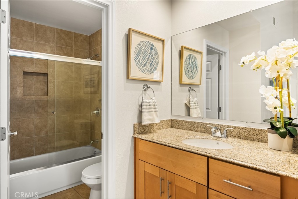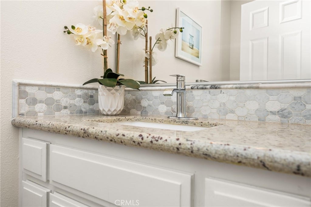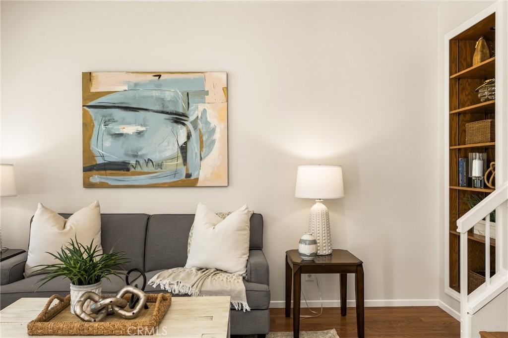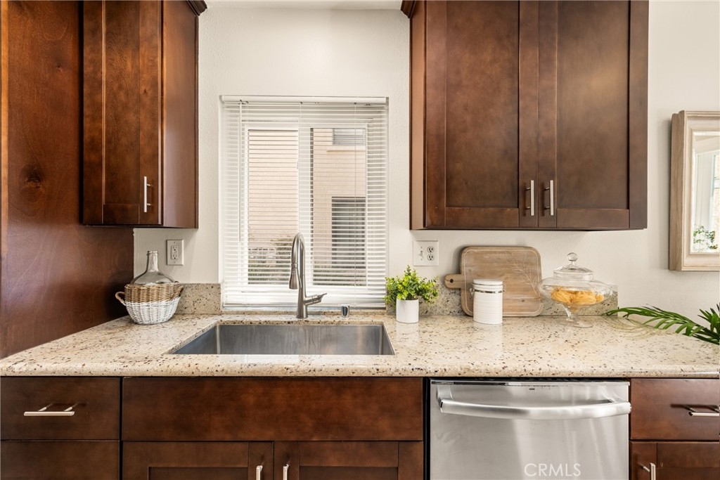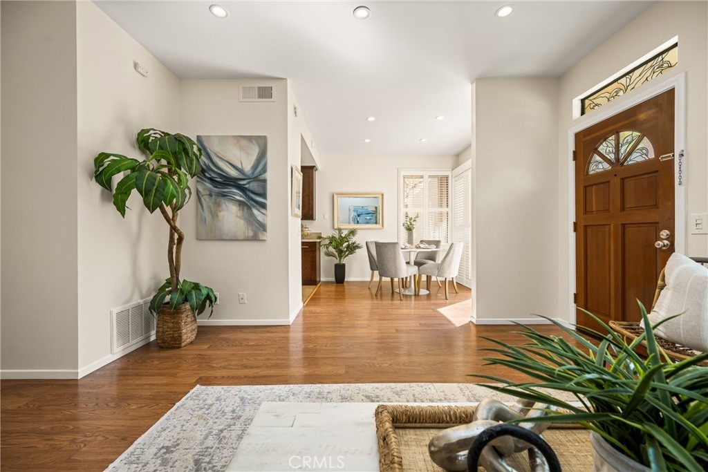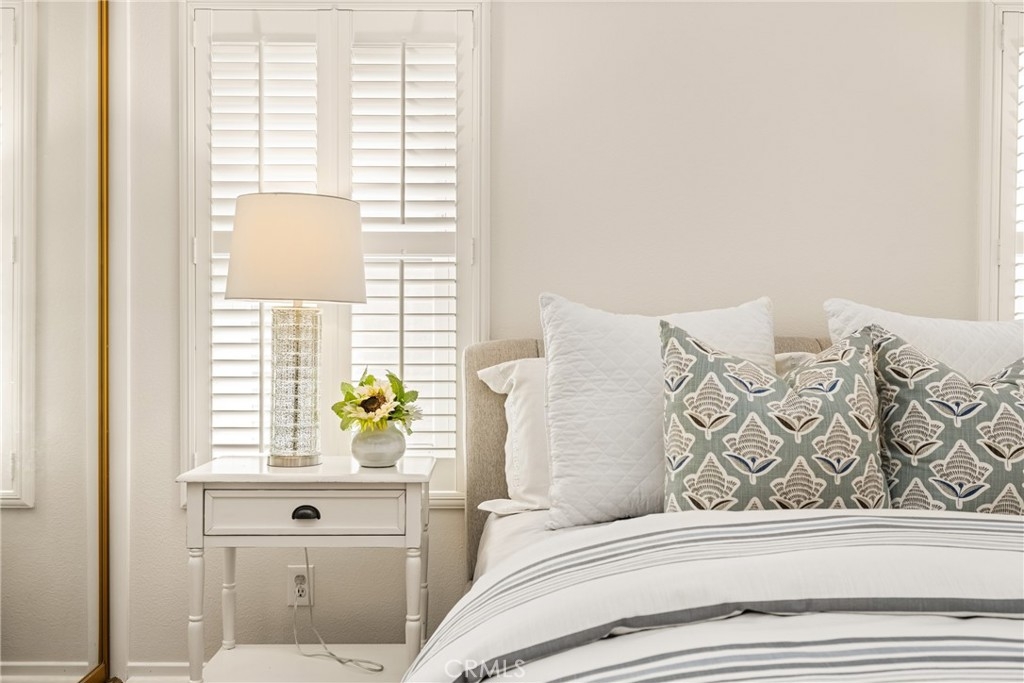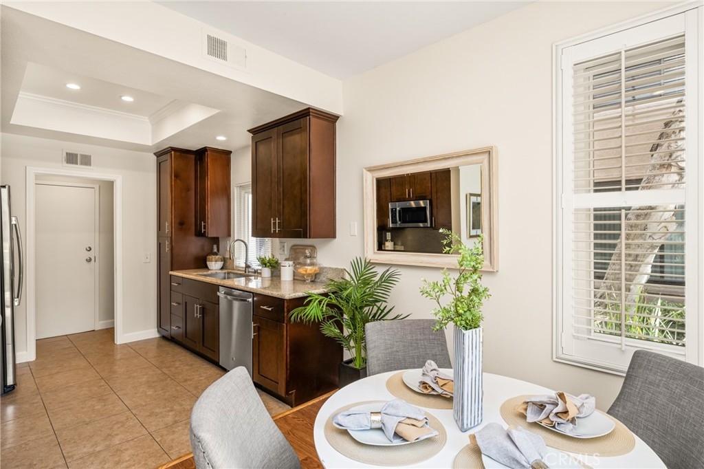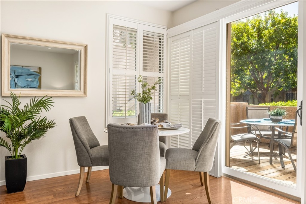 Nestled in the East Orange Foothills, this remodeled end-unit townhome offers a perfect blend of modern comfort and style. With one shared wall, this 3-bedroom, 2.5-bath home is move-in ready and designed for convenience. Step inside to find a welcoming living room featuring a built-in bookcase and display area. The home is filled with natural light thanks to newer dual-pane windows and elegant plantation shutters throughout. The beautiful wood-look laminate flooring runs throughout the main areas, adding a touch of elegance. The dining area overlooks the front patio through sliding doors, perfect for indoor-outdoor living. Enjoy your morning coffee or evening stargazing outside on the newly renovated wood deck. The kitchen is a chef's dream with rich wood cabinets, a designer back-splash and granite countertops. It also includes GE stainless steel appliances including side-by-side refrigerator with water & ice, dishwasher, electric range, microwave and a deep prep sink. A convenient inside laundry room offers full-sized washer & dryer hookups and additional storage cabinets. A main floor 1/2 bath features a granite-topped vanity with custom tiled back-splash. Upstairs, the primary suite boasts a remodeled full bath with a large tiled shower over tub, custom glass enclosure, new wood vanity and elegant finishes. The primary bedroom with high ceilings offers an extra large closet with 3 mirrored doors and custom organizers. The two upstairs guest rooms also feature high ceilings and are freshly painted and ready to move in. The remodeled upstairs guest bath includes a shower over the tub plus a shaker style vanity with a beautiful countertop and new fixtures. Additional features include fresh interior paint, newer HVAC system with central heating and air conditioning, recessed lighting, new raised panel doors and so much more! This amazing property offers direct access to a 2-car garage with overhead storage, a wall of custom cabinets and newer roll up door. Enjoy the great association amenities including the large community pool and recreation area plus a smaller pool within walking distance. Located close to Santiago Canyon College, Peters Canyon, Irvine Park and Lake, the Pacific Ranch Market & Shopping Center, plus hiking and horse trails. Don't miss this opportunity to own a stunning home in a desirable location!