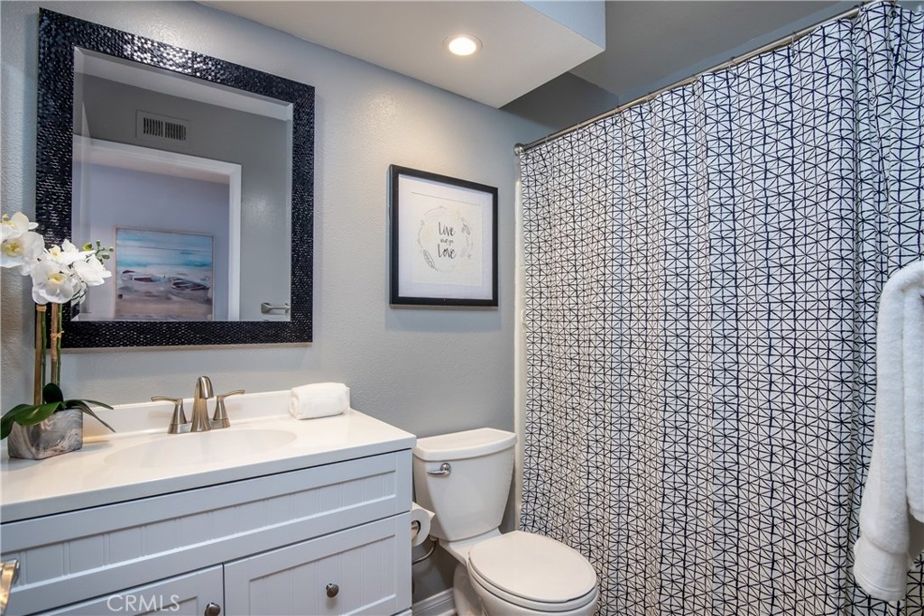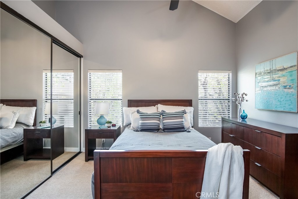 Great end unit, upper level, condo with a great floor plan and room configuration. The first thing you notice is the large open-air patio, great for entertaining, dining al fresco, or simply relaxing. Open the front door and you enter the well-proportioned living room with vaulted ceilings, 2 full sized windows, upgraded flooring and loads of room. A separate formal dining room off the kitchen boasts loads of natural light and a great central gathering space with additional counter sit up space facing the kitchen. Two full sized bedrooms with vaulted ceilings, each with 3 door full sized closets provides plenty of space for even the most extensive wardrobe selections. The master bedroom features a fully upgraded ensuite bathroom with dual sink vanity and large glass and tile enclosed shower. The remodeled second bathroom offers a shower over soaking tub. Compose that perfect home office, additional media or welcoming guest room in the upstairs loft which has 2 great skylights and additional storage closet. The central location of this home is ideal, making for easy commutes to either the mountains or down to the great SoCal beaches. You’ll love the proximity to great local parks, nature walking trails, a quick drive down 55 freeway to John Wayne Airport for your travel needs and great local shopping and dining. Central air conditioning, freshly painted, interior laundry room, private garage and more.