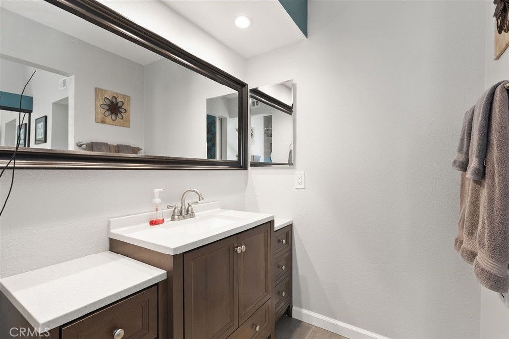 Gorgeously updated two story upper unit in the Canyon Glen community. Complete with two large bedrooms, two full bathrooms and an open loft this is the perfect space to call home. As you enter the home you are greeted by vaulted ceilings, an open living room and beautiful vinyl flooring. From the living room you enter into the updated kitchen where no detail was overlooked. Stunning white shaker cabinets with beveled subway tile backsplash and quartz countertops surrounded by stainless steel appliances create this dreamy kitchen. Off the kitchen is the dining area currently utilized as a family room. Down the hall you will find both bedrooms, the guest bath and inside laundry. The secondary bedroom is open with the continuous vaulted ceilings, tons of closet space and natural light. The guest bathroom has been beautifully updated with a single vanity with white countertops, tub in shower and detailed tile work. The master bedroom is the ultimate retreat with lots of closet space and ensuite master bath. Pass through the barn door into the wonderfully updated bath with single vanity and extra storage. Other features of this home include a 2 car garage with separate entrance, ceiling fans, inside laundry, front balcony and more. The community grounds feature large grass areas, and offers two pools and spa areas. Nearby El Modena trails, Irvine, Santiago Oaks and Peters Canyon Regional Parks. Conveniently close Award winning OUSD Schools, shopping, dining, and entertainment.