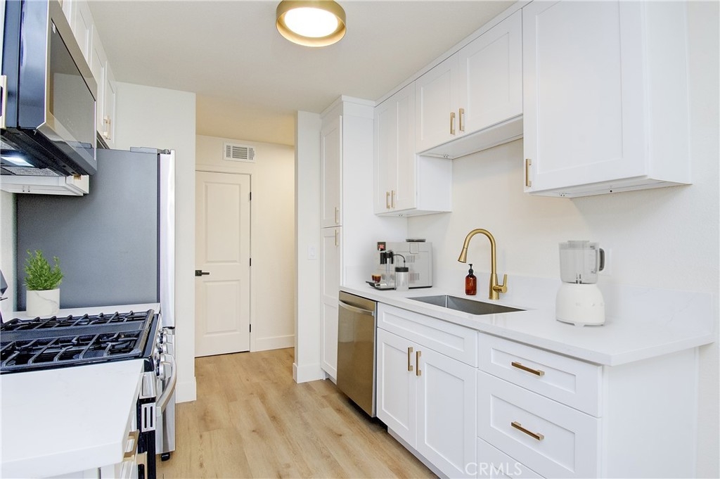 Imagine starting mornings along the tranquil tree-lined paths that lead to your own ground-level retreat in the La Veta Monterey Condominiums! Vinyl windows pour sunlight across upgraded luxury vinyl flooring throughout, giving the living areas a bright, relaxed vibe while sliding glass doors invite you out onto a secluded front patio ideal for coffee, conversation, or entertaining. The refreshed kitchen blends style and function with its quartz countertops, new appliances, and a cheerful breakfast nook that makes meals feel effortless. Inside your generous primary suite, a wide closet, renovated ensuite with a walk-in shower, and direct access to the fenced backyard create a private corner to recharge. The second bedroom and full bath offer versatility for guests, hobbies, or as a home office. Notables include fresh interior paint, updated HVAC, and a 1-car garage with a newly installed door. Residents enjoy a community clubhouse with a pool, basketball court, and BBQs, all in proximity to parks, MainPlace Mall, CA-22, and I-5. Come experience how naturally your next chapter could feel here!