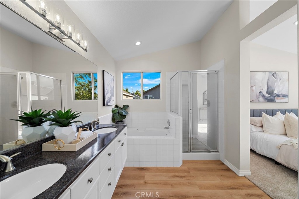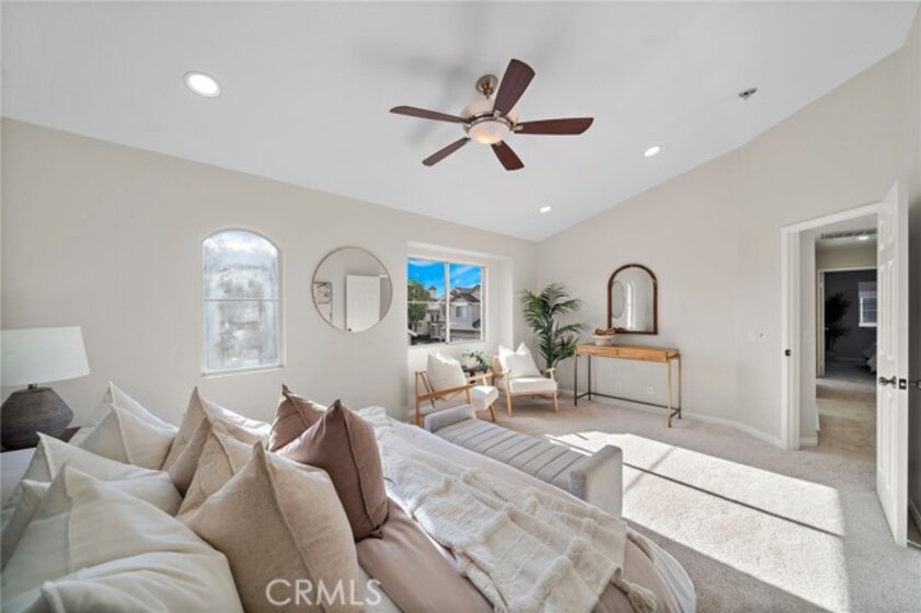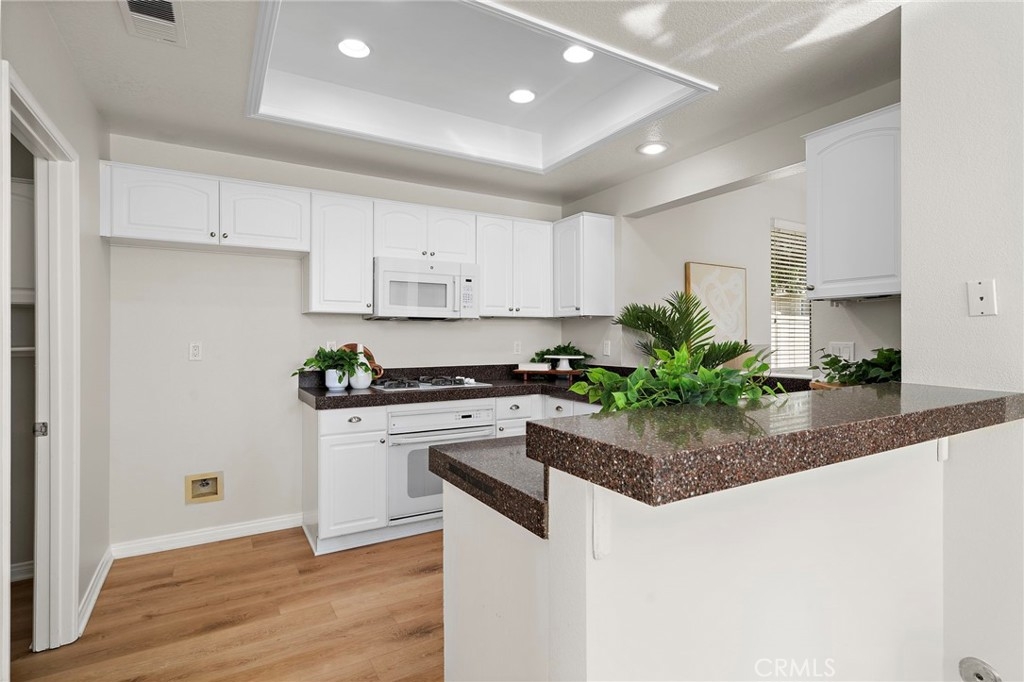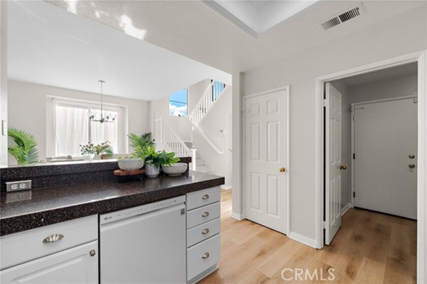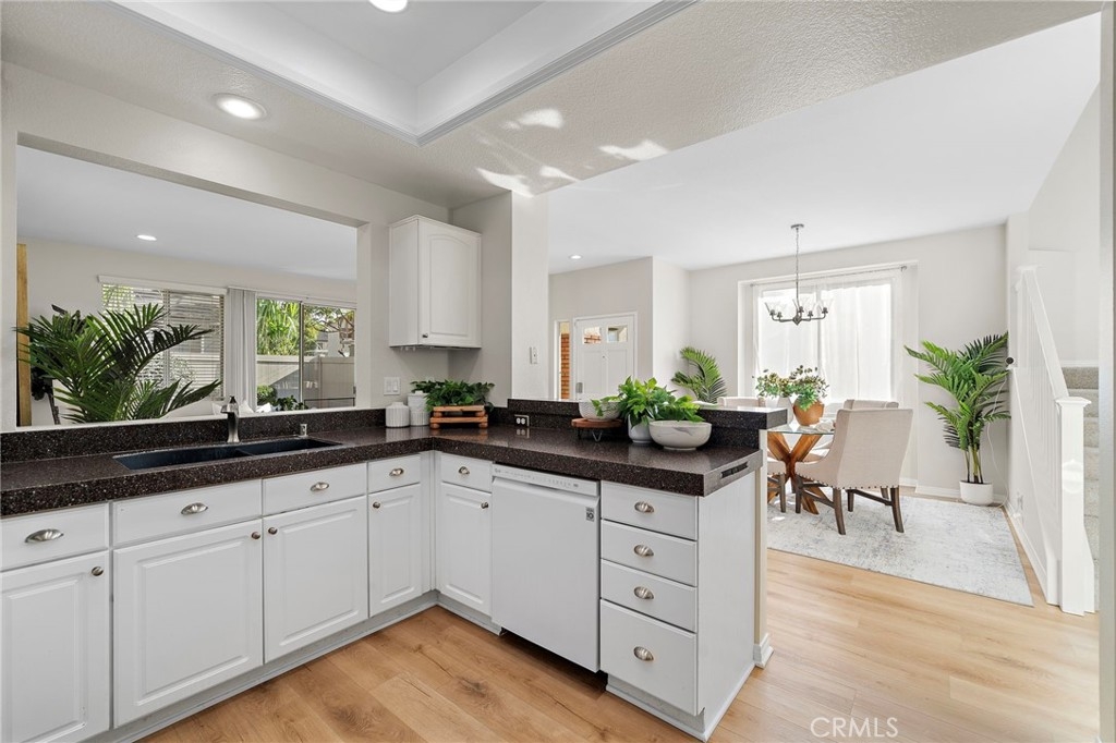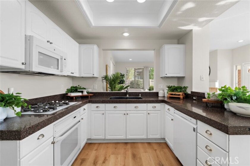 Welcome to 834 Kintyre, a beautifully updated end-unit townhouse-style condo in the gated Stratford of Huntington community. This semi-detached home shares only one partially attached wall and features a wraparound backyard, offering added privacy and outdoor living space. Recently upgraded with new carpet, luxury vinyl plank flooring, fresh paint, upgraded LED lighting, and refreshed bathrooms, this move-in ready home is light, bright, and inviting. The open dining area is filled with natural light and flows into a clean, modern kitchen with warm tones. The cozy living room with gas fireplace creates a welcoming space for relaxing or entertaining. Upstairs, the spacious primary suite features vaulted ceilings, a walk-in closet, and a primary bathroom with separate soaking tub and walk-in shower. Two additional bedrooms and two bathrooms provide comfortable living and flexibility for a growing family, home office, or guests who will love to visit. The finished two-car garage has been recently upgraded with epoxy flooring, fresh paint, and hexagon LED lighting, ideal for car enthusiasts or a workshop. Resort-style community amenities include two swimming pools, spa, clubhouse, and gated access, with sidewalks throughout for walking. Located near well-rated schools, shopping, dining, bike and walking trails, and easy freeway access, this home offers convenience, comfort, and lifestyle in the heart of Orange. Enjoy nearby attractions—or simply relax in a beautiful place to call home.
